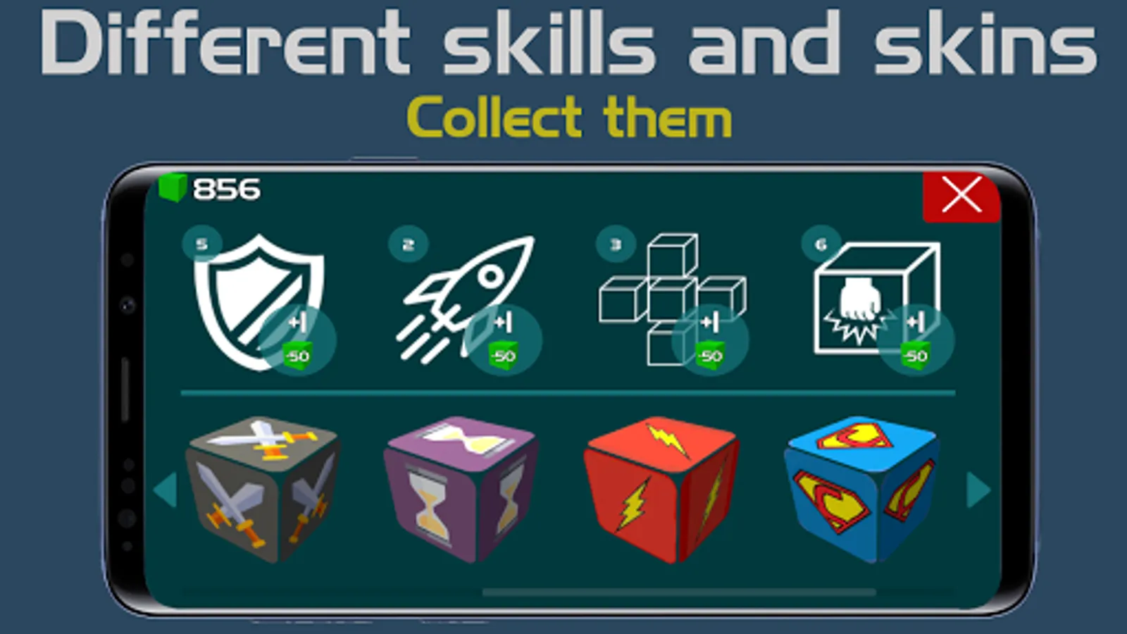 You need to be skillfull avoiding enemies and traps, survive using smartly your skills and attacks. You will find this attacks distributed over the entire map, or you can also buy more at shop. It is very important to improve your cube hero buying new skins and weapons. These skins improves a lot your attributes.