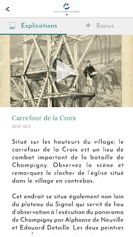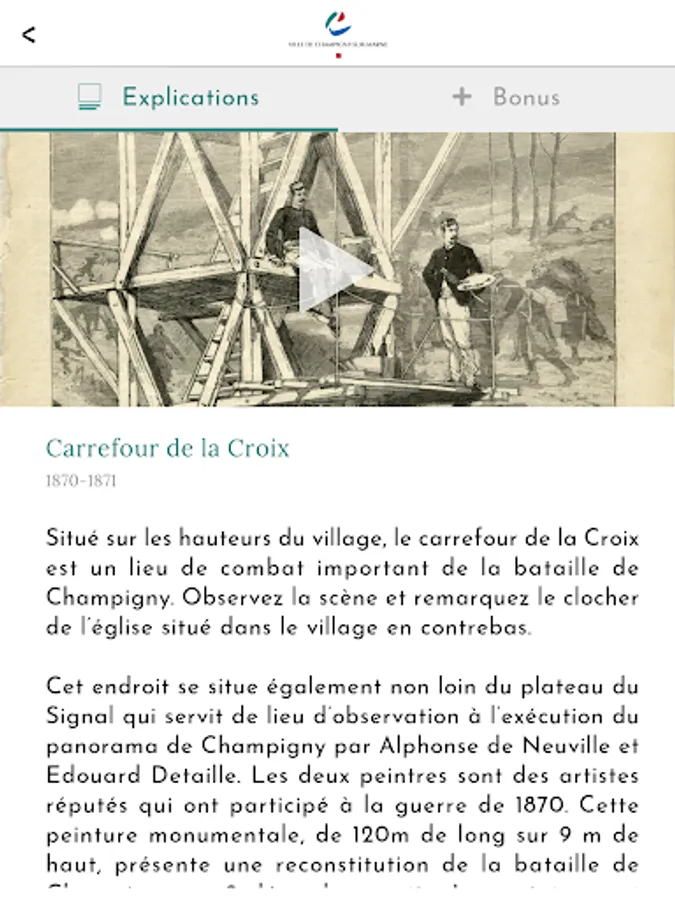 Champigny Story is a fun and interactive visit! Immerse yourself in the heart of the battle thanks to 360 reconstructions with sound, understand more in depth the history of the war of 1870-1871 with interpretive mini-games, go further by watching videos ... Each point geolocated promises new surprises!