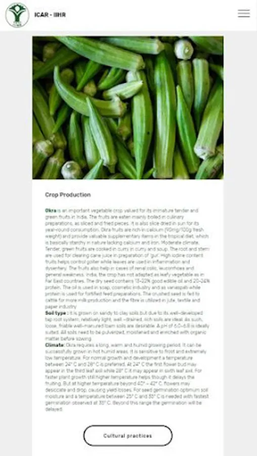 The Disease and Pest management includes various diseases and pests affecting Okra crop describing its symptoms and control measures to be taken by the farmers for better management of their crop and IDM & IPM strategies also provided. Further, IIHR released Okra varieties and hybrids along with salient features are also included, the other promising varieties also included.