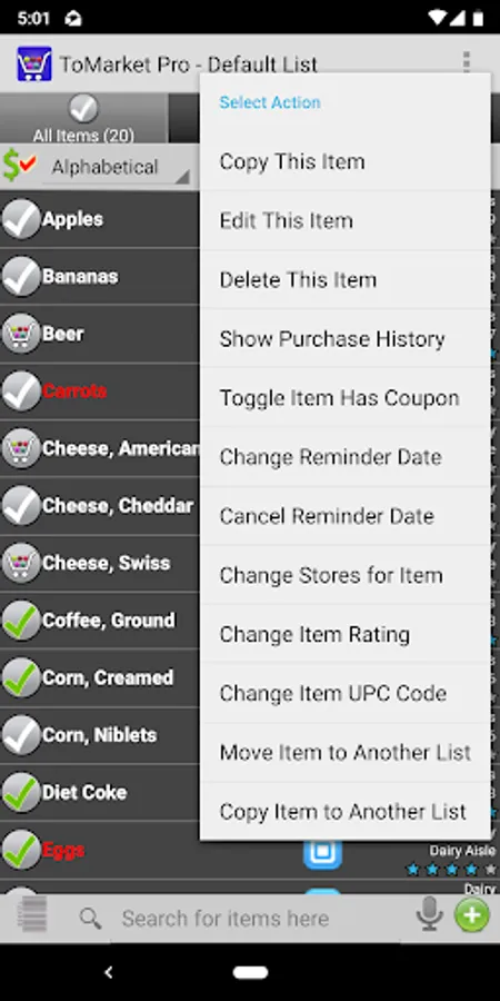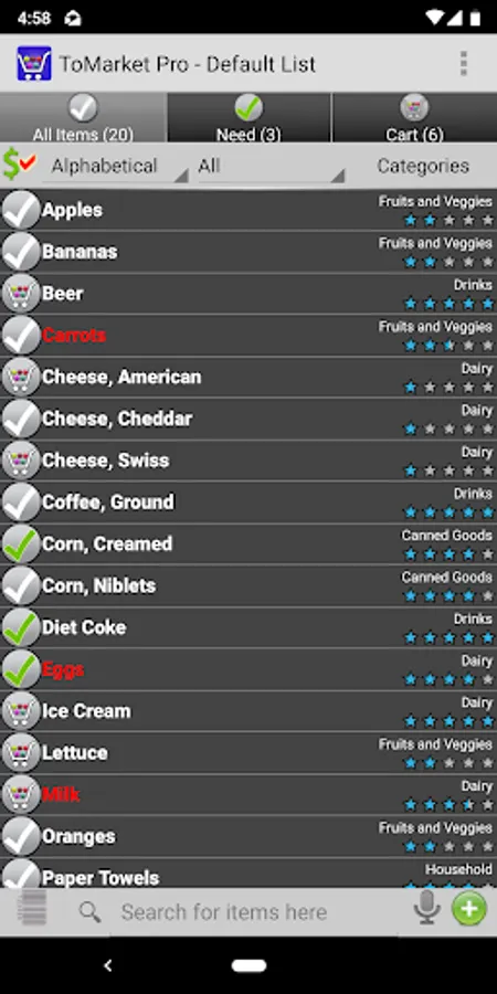 Voice Recognition – Search for items on your list and easily move it to need or cart. Add items by saying "NEED apples AND oranges AND bacon" or "ADD bacon"