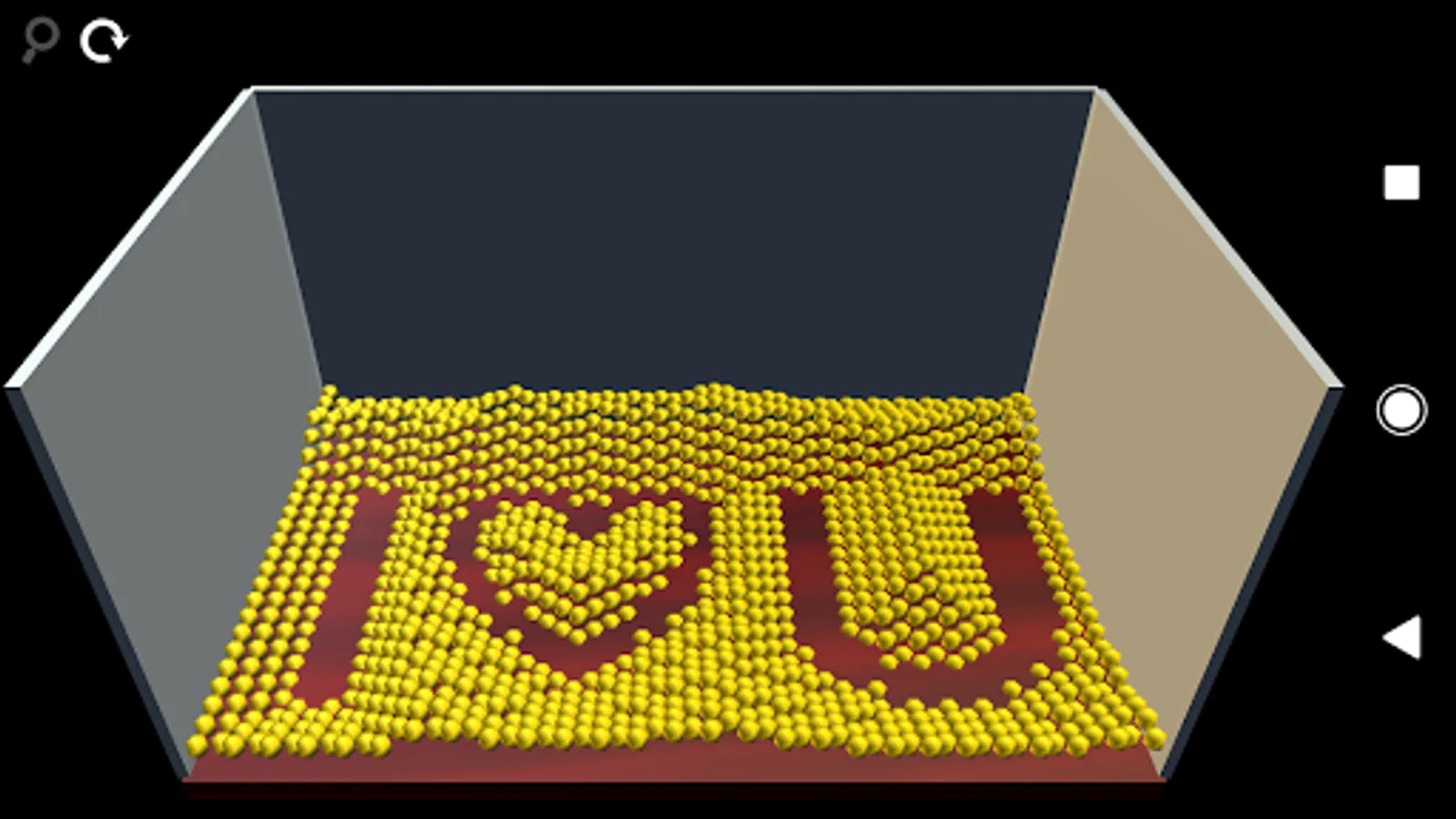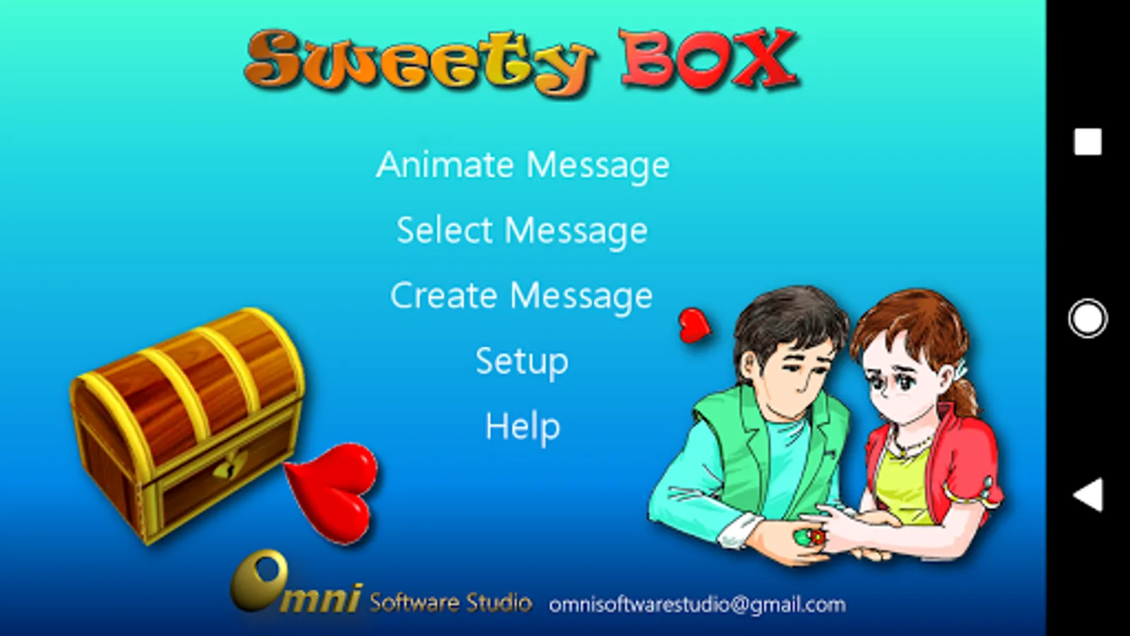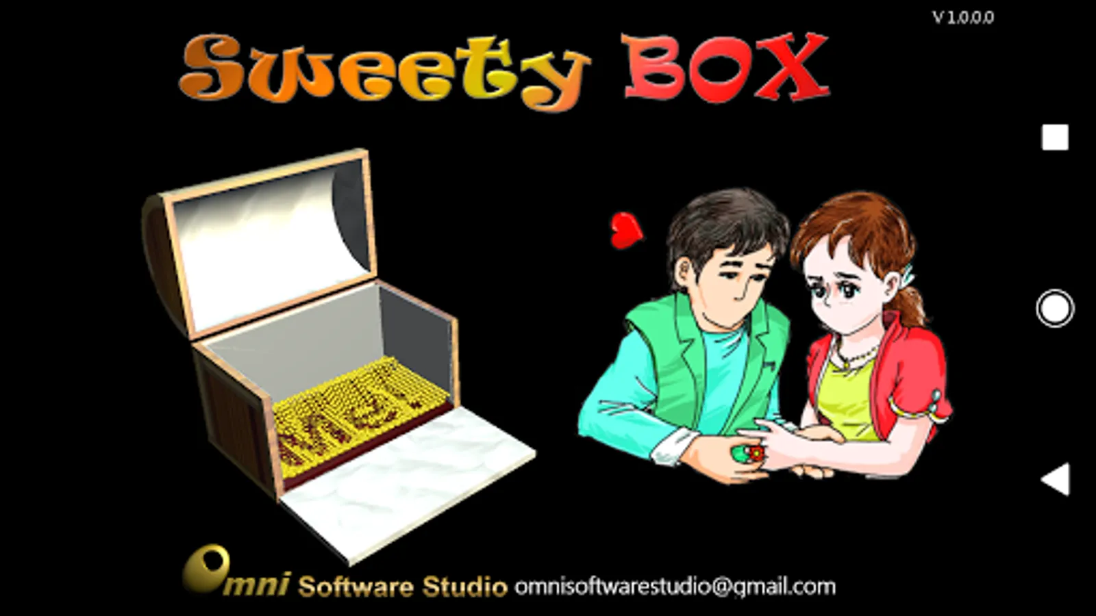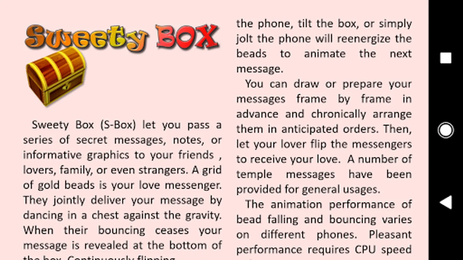 Sweety Box (S-Box) let you pass a series of secret messages, notes, or informative graphics to your friends , lovers, family, or even strangers. A grid of gold beads is your love messenger. They jointly deliver your message by dancing in a chest against the gravity. When their bouncing ceases your message is revealed at the bottom of the box. Continuously flipping the phone, tilt the box, or simply jolt the phone will re-energize the beads to animate the next message.