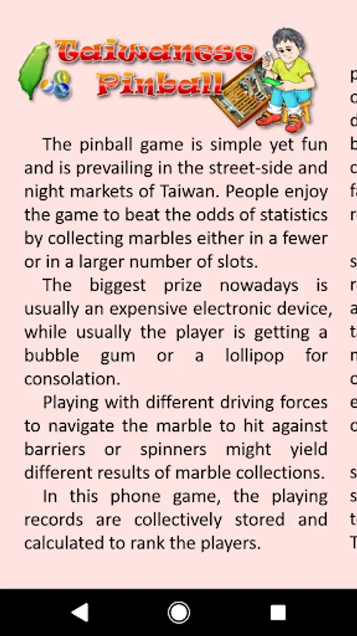 The pinball game is simple yet fun and is prevailing in the street-side and night markets of Taiwan. People enjoy the game to beat the odds of statistics by collecting marbles either in a fewer or in a larger number of slots.