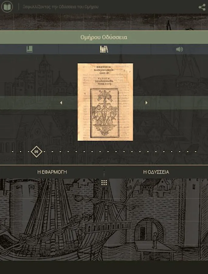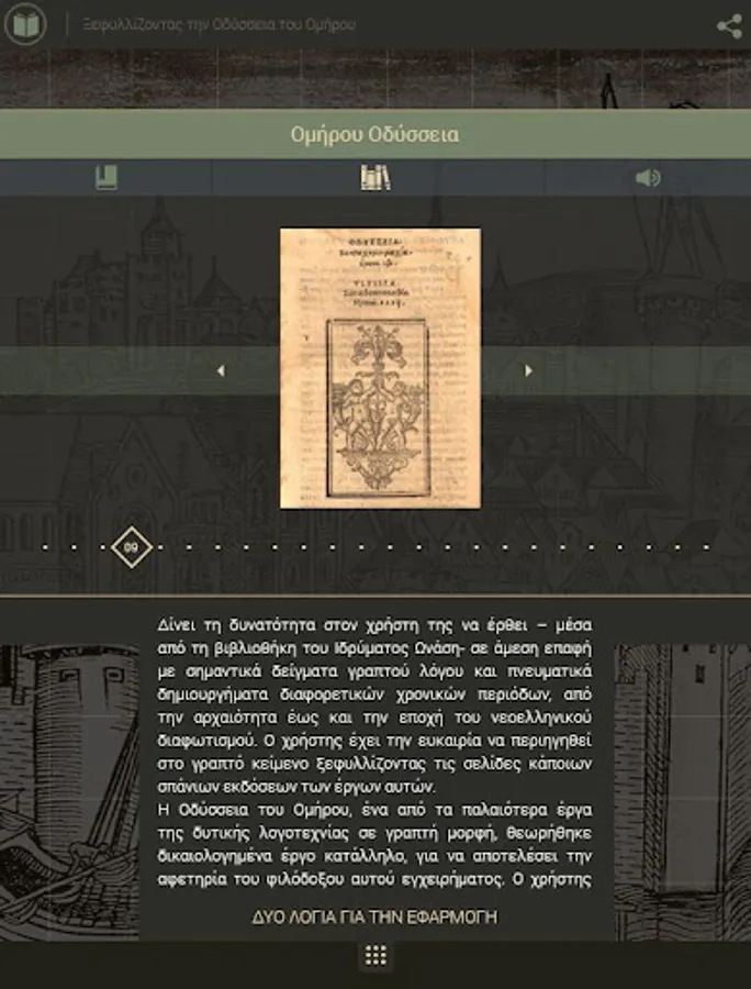 The application "Browsing Homer's Odyssey" offers the possibility to the user to come through the Onassis Library in direct contact with important examples of written language and intellectual creations of different periods, from antiquity up to the age of Enlightenment.