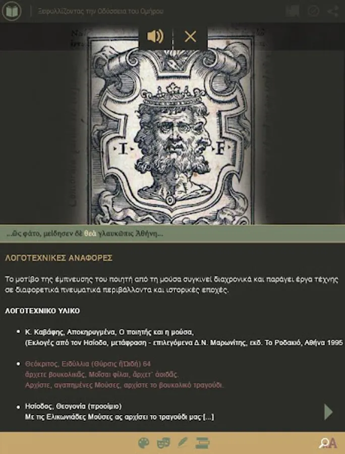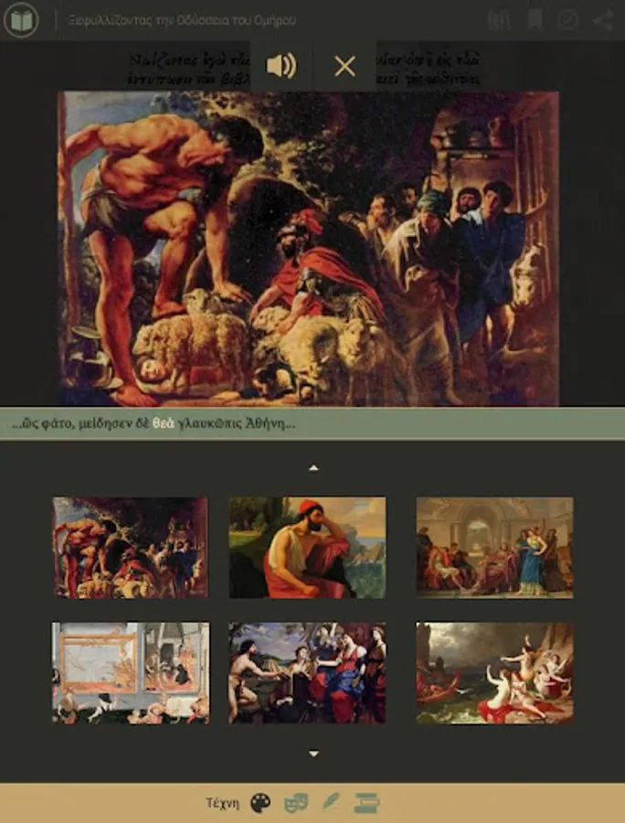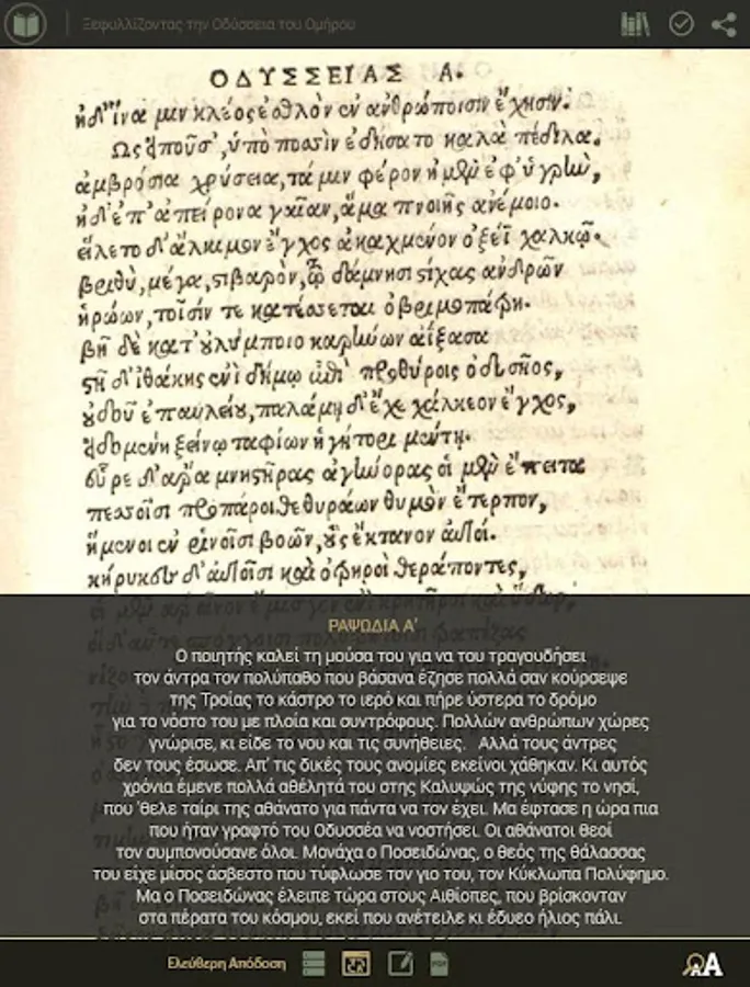The user has the opportunity to tour the written text leafing through the pages of some rare versions of these works. The Odyssey of Homer, one of the oldest works of Western literature in written form, was justifiable project appropriate to the starting point of this ambitious project.