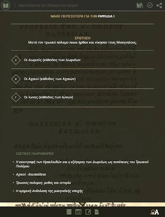 The possibilities and tools of implementation and the accompanying explanatory texts and audiovisual material incorporated allow the user a more experiential and integrated approach of the Homeric epic.