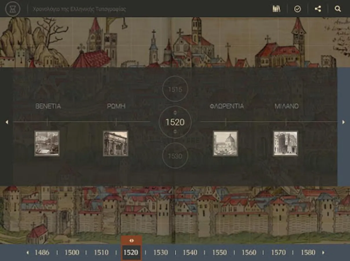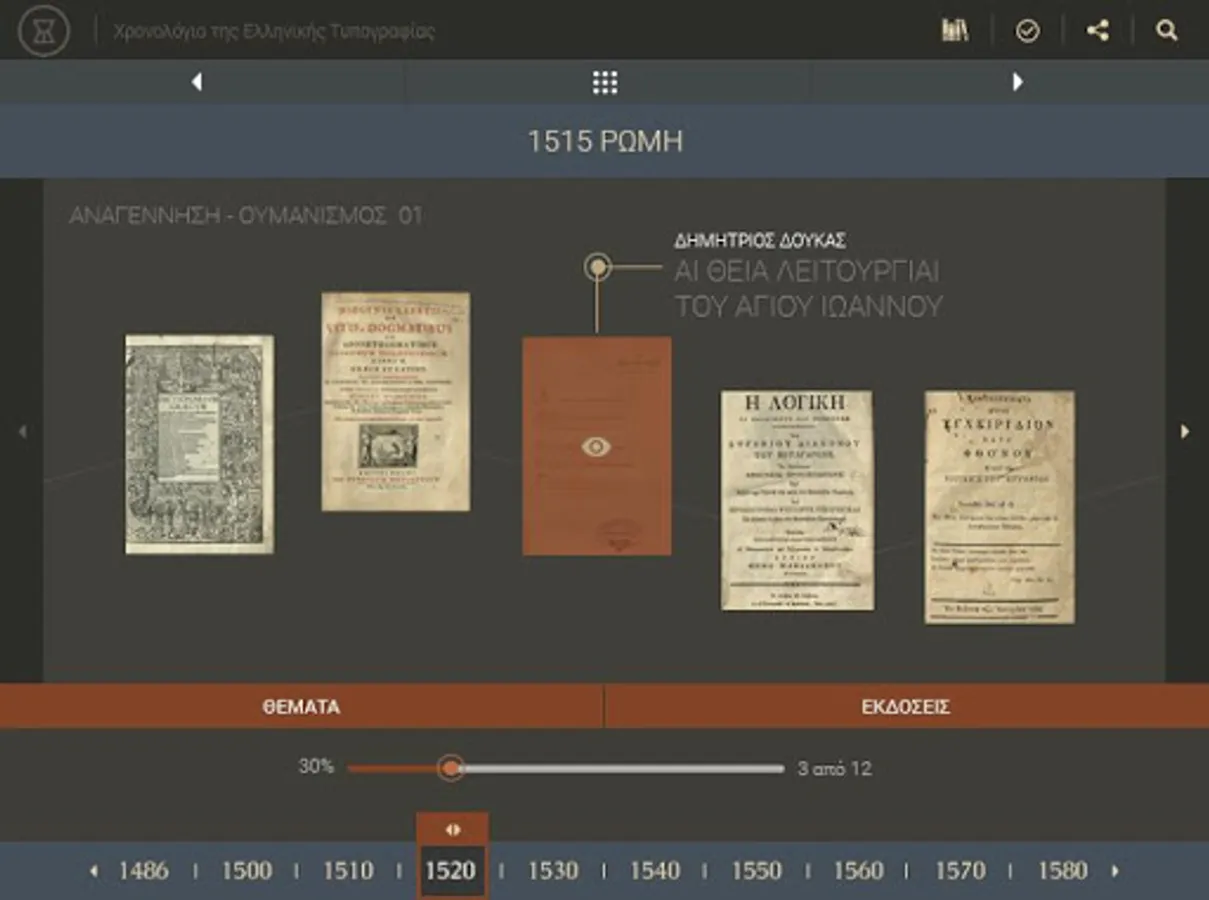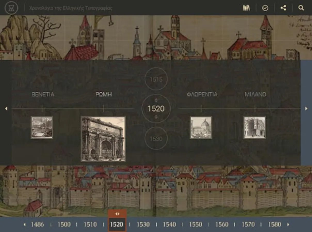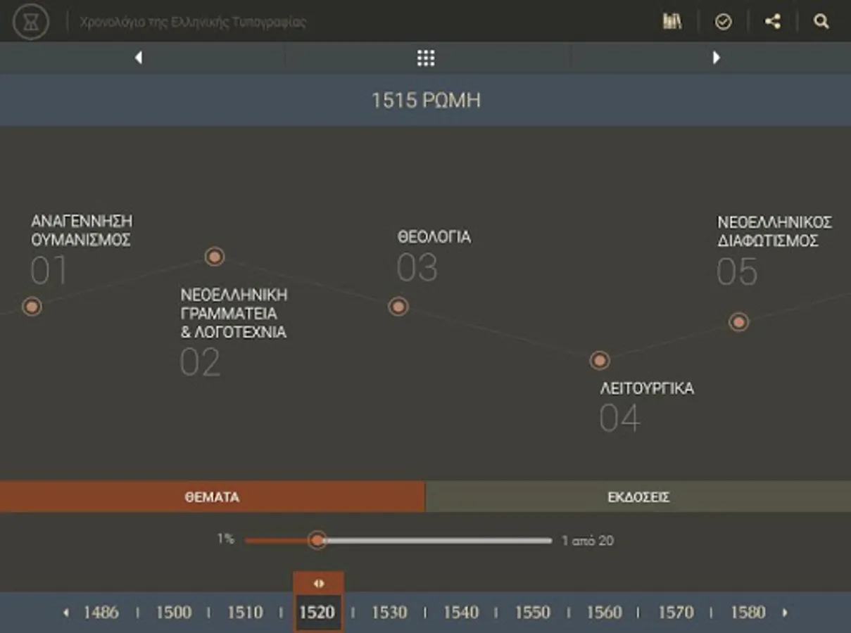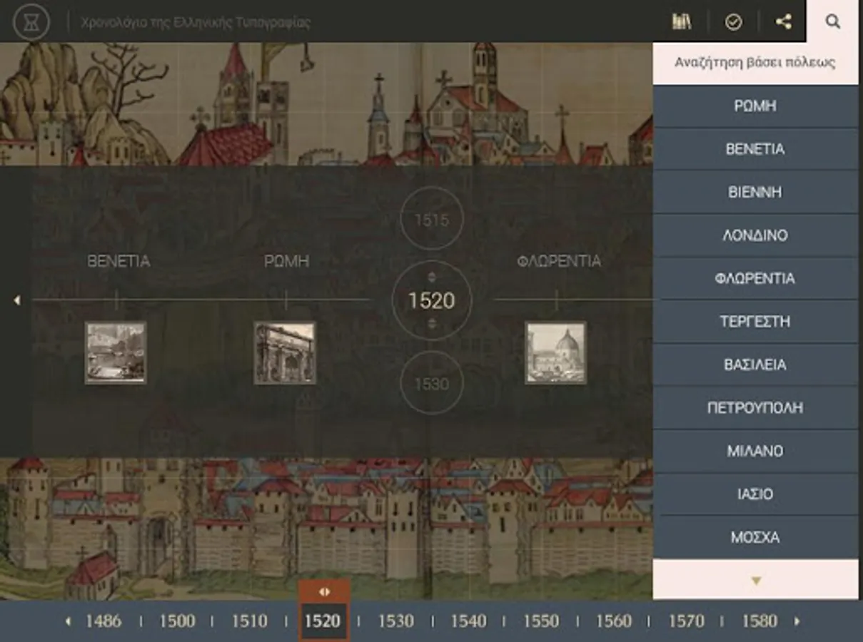 Through the implementation of "Chronology of Greek Typography", the user selecting a specific date or city, following the historical versions course, publishers and important personalities from the 15th to the 19th century and discover the typographical adventures of scholarship and of books as publisher event.