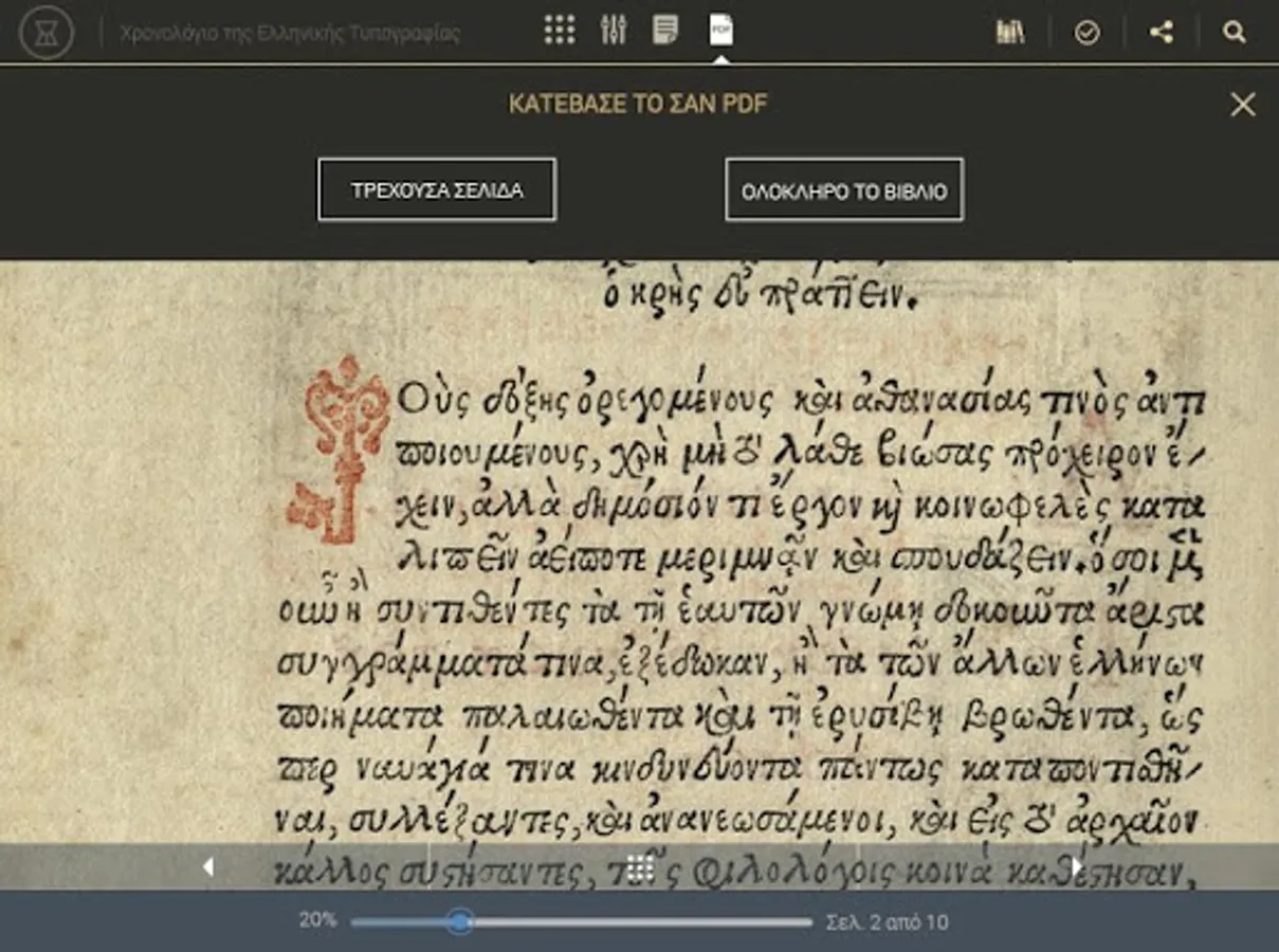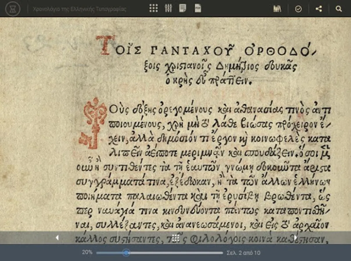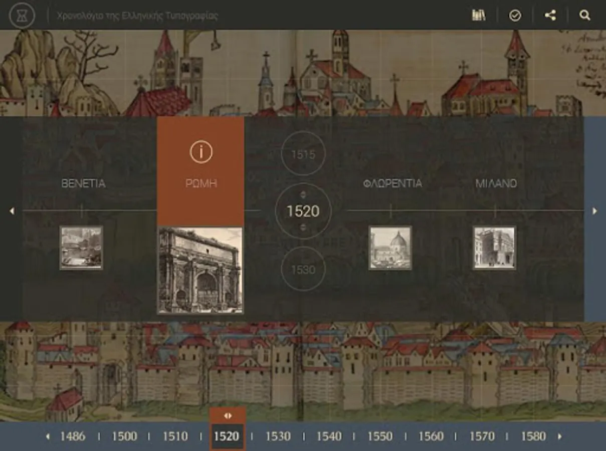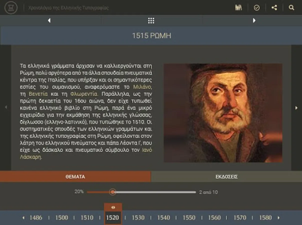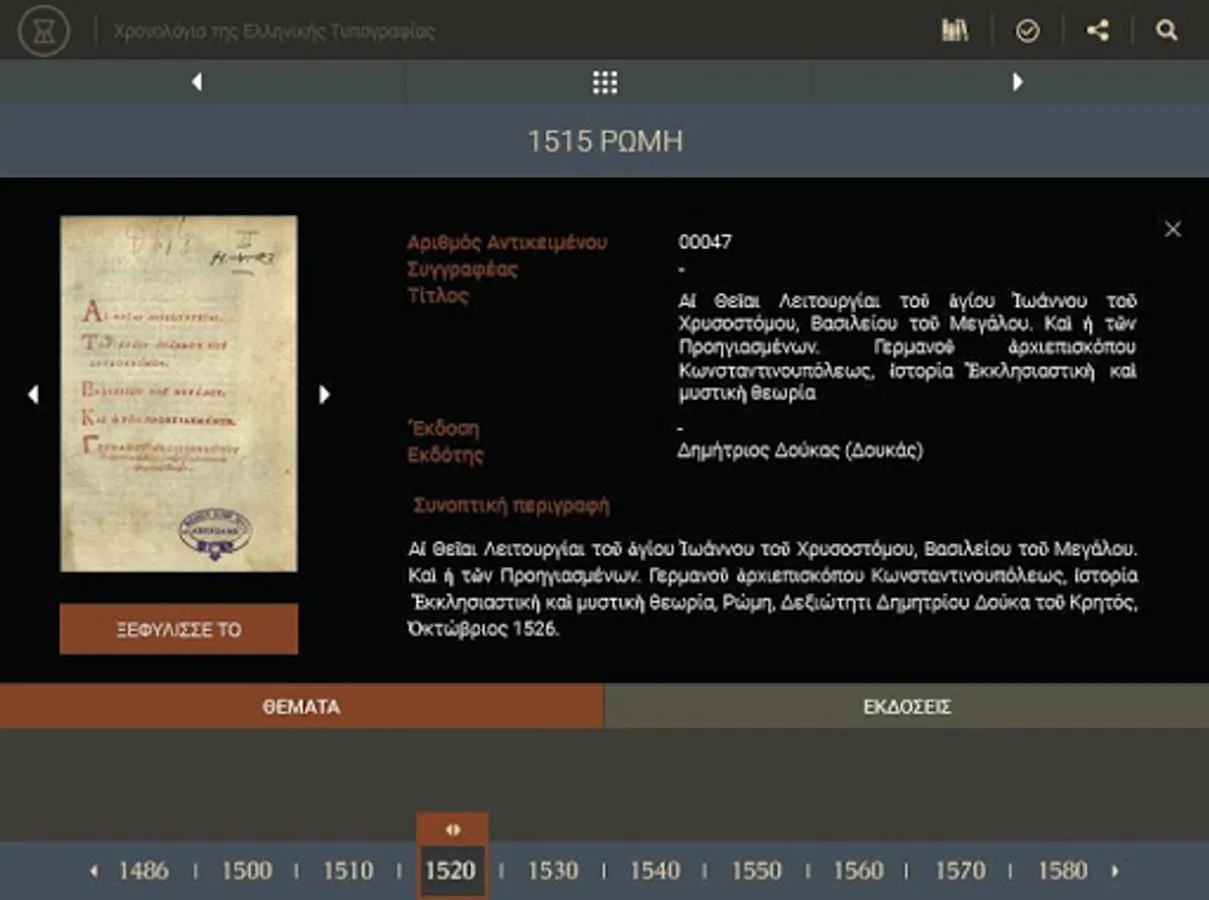 Through the implementation of "Chronology of Greek Typography", the user selecting a specific date or city, following the historical versions course, publishers and important personalities from the 15th to the 19th century and discover the typographical adventures of scholarship and of books as publisher event.
