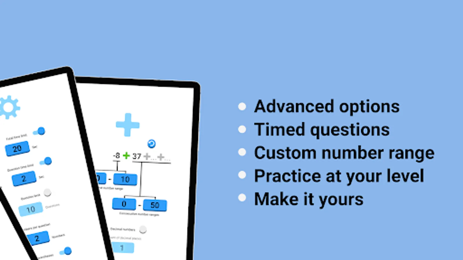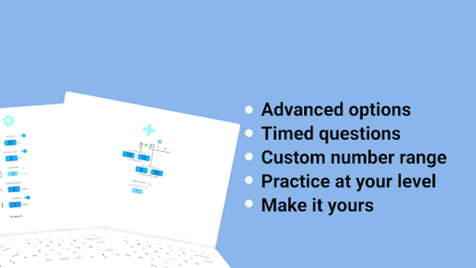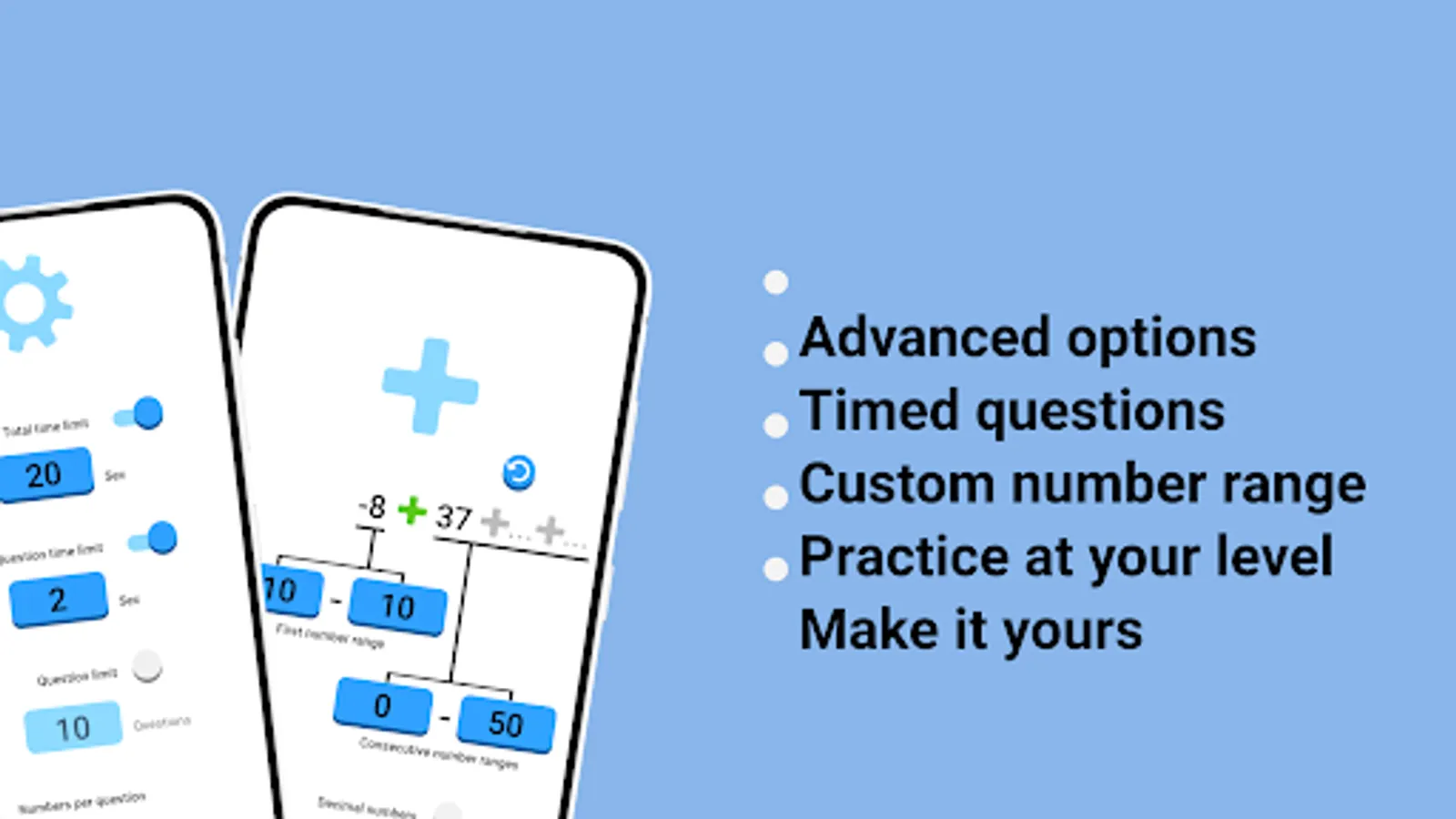 Matix supports advance options where you can set mixed operators, decimal arithmetic questions, several bracket questions and custom time and questions limits, all coupled with custom number ranges, you can get ready for your speed math race tournament and other demanding arithmetic challenges. And this is all backed with an improvement system, so you practice the questions more you struggle with.