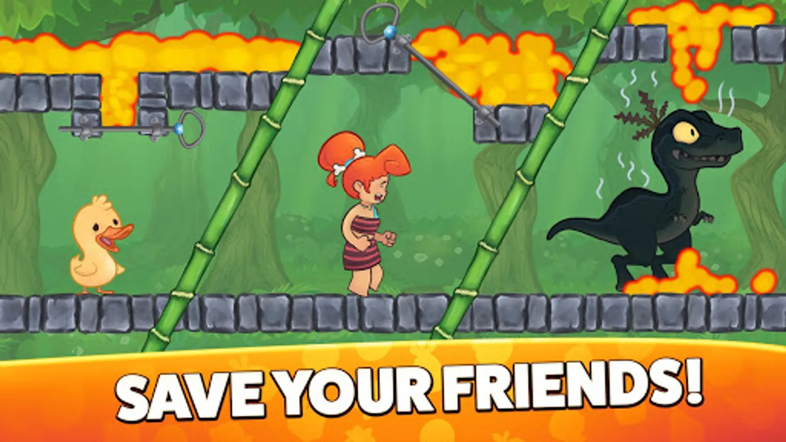 Pull the pins to rescue perla and the ducks, to stop blue the hungry 🦖dinosaur, to get fruits🍑🍎🍍🍊.