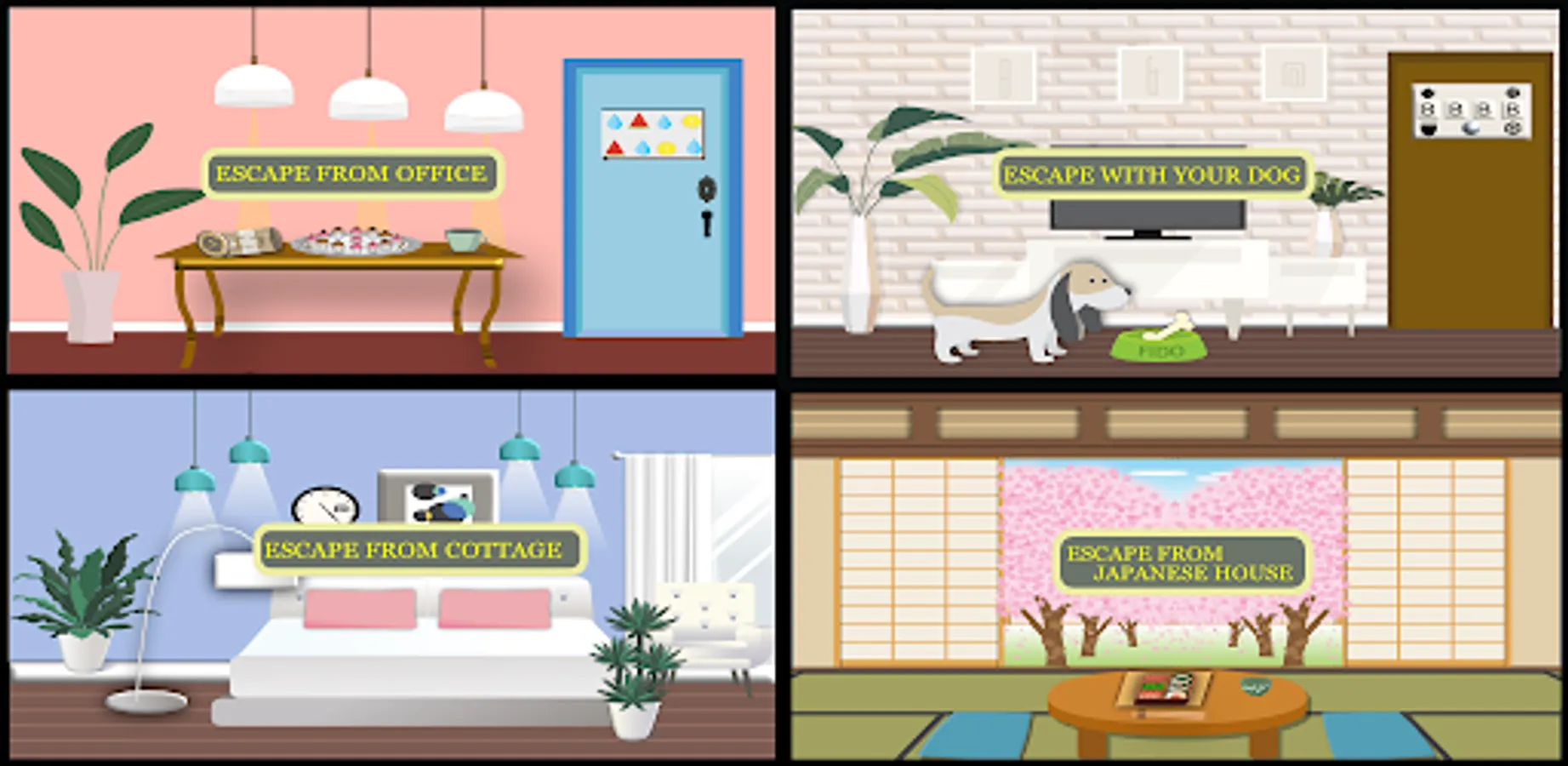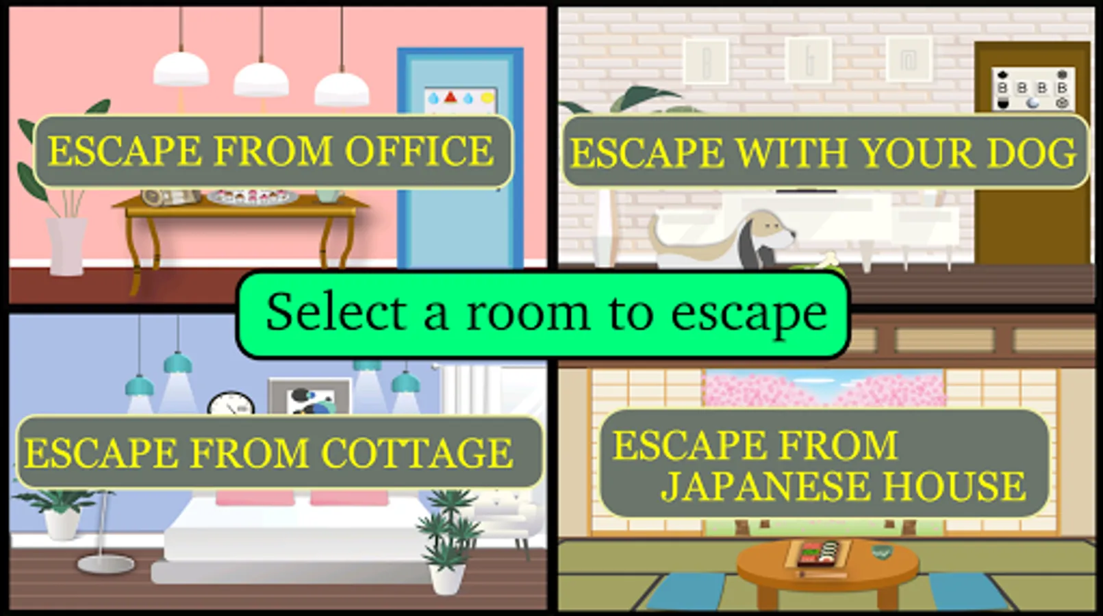 A 4 in 1 escape room adventure! Travel and beat each room to complete the game. Includes the pre-released Escape From Office, Escape From Cottage, Escape With Your Dog, and Escape Japanese House all in one bundle! Have fun on your escape journey and take your time through each of the four rooms.