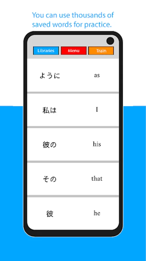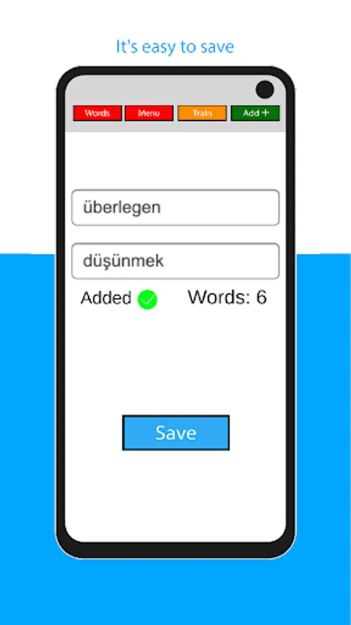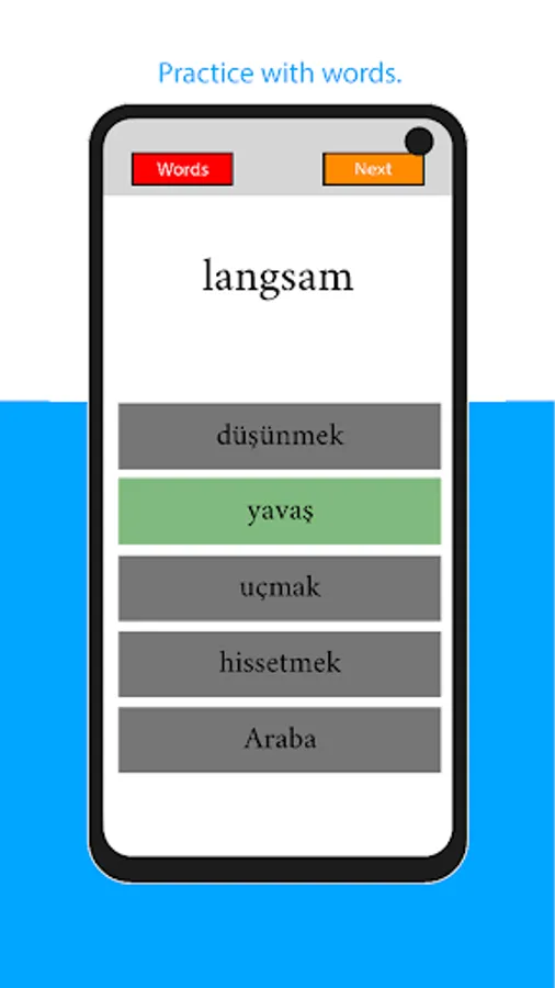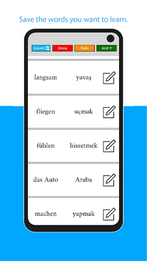 Save the words you want to learn and practice with the words you have saved. Improve your vocabulary and directly add new words.