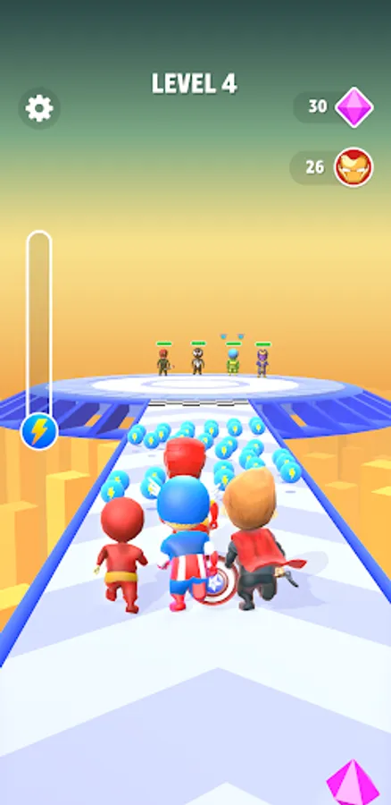 Collect equipment for each hero while running and join them into your team. Make dream-team from your favorite superheroes. Train, power-up your heroes and lead them to the final battle. At the end defeat your enemy, become strongest avenger and save the world!
