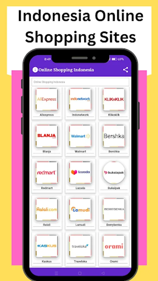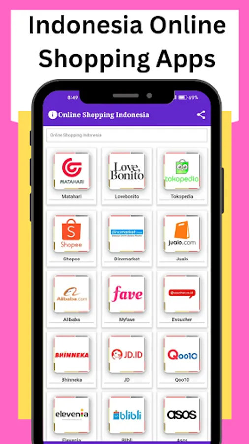 Indonesia Shopping App – Online Shopping Indonesia, is All in one Indonesia's online shopping app>/b> which is easy to use and give you access to Most popular online shopping app. This application is for helping you with your Top shopping app in Indonesia at one place only. Very less storage occupying app which will Keep Your Phone Memory Safe. Simple to use and shop on your all Favorite Shopping Websites 🛍️.