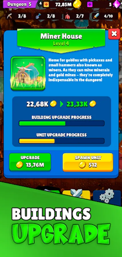Welcome to Goblin Invasion - idle game which combines all your favourite mechanics! Become the Great Leader of the Goblins Tribe and lead your race to the greatness and prosperity. Gold and Goblins, Power and Wisdom will help to kick your enemies out of your Dungeon Kingdom, mine factory tycoon skills will help you to increase the strength of your army, build an empire, earn gold, level up and become the strongest goblin tribe in the whole world!