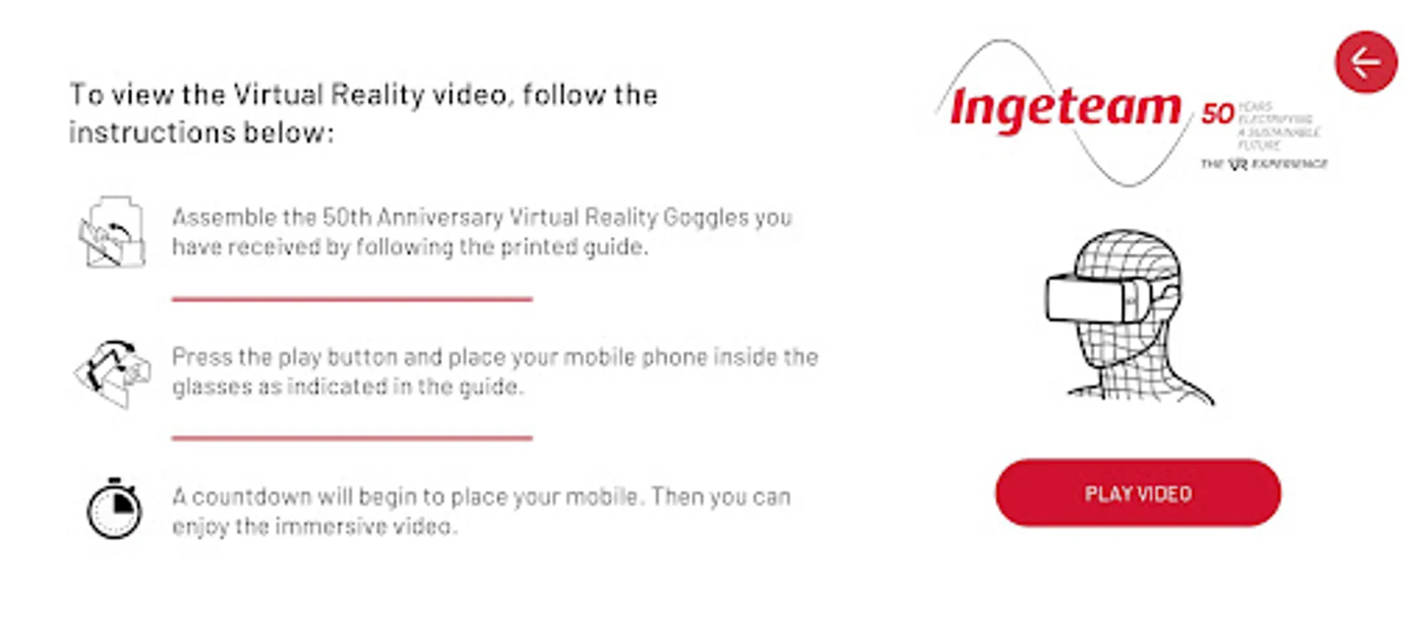 In this app you can enjoy the Virtual Reality experience developed to commemorate Ingeteam's 50th Anniversary. In order to enjoy the experience in the most optimal way, it is recommended to have the VR cardboard glasses provided by Ingeteam. You can also enjoy the experience if you do not have the exact model of cardboard glasses by using the buttons on the VR view to change the model of glasses to use or enjoy the experience without glasses.