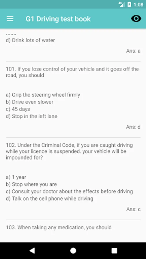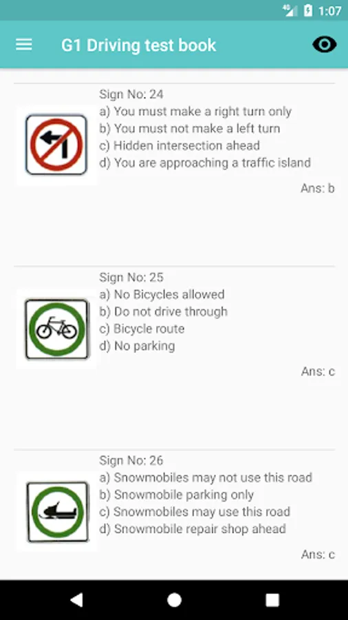 G1 Driver's Handbook will help you pass G1 written test, this application contains almost 200 Questions on Traffic Signs and Rules of the road. Check your nearest test location . This Application will help you prepare and pass G1 Written test.