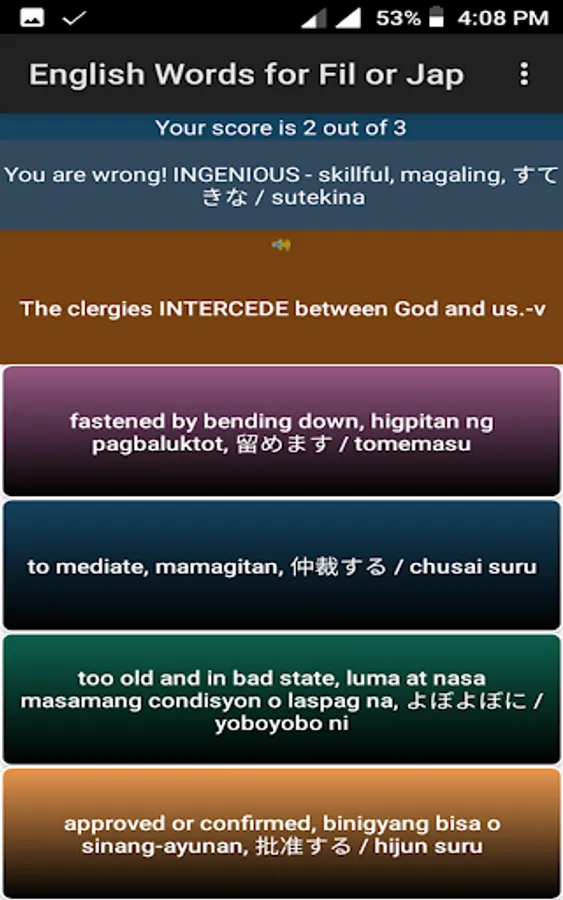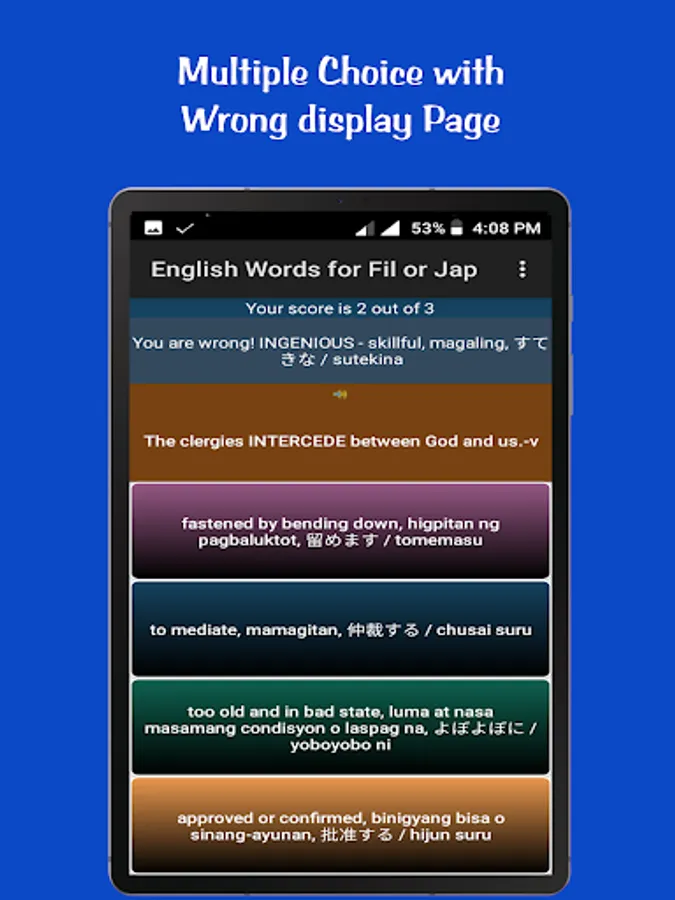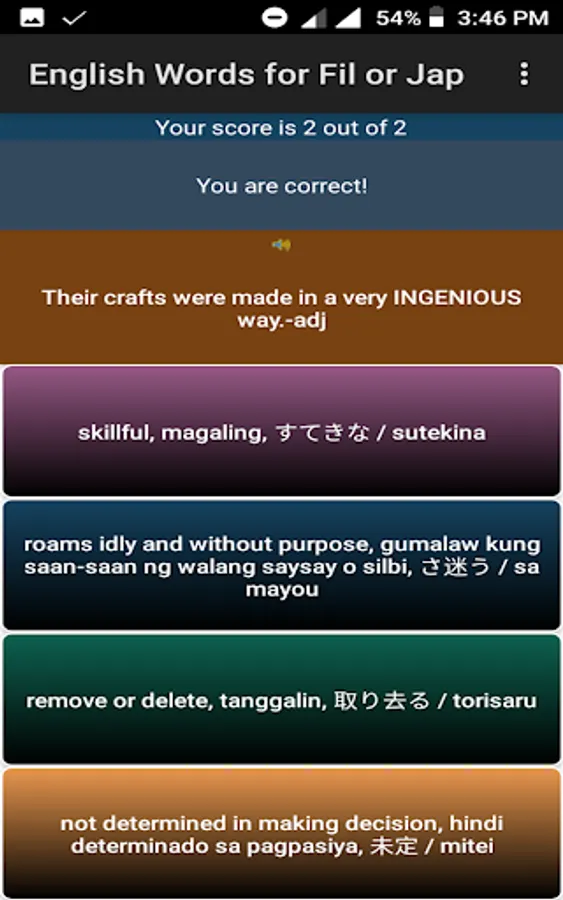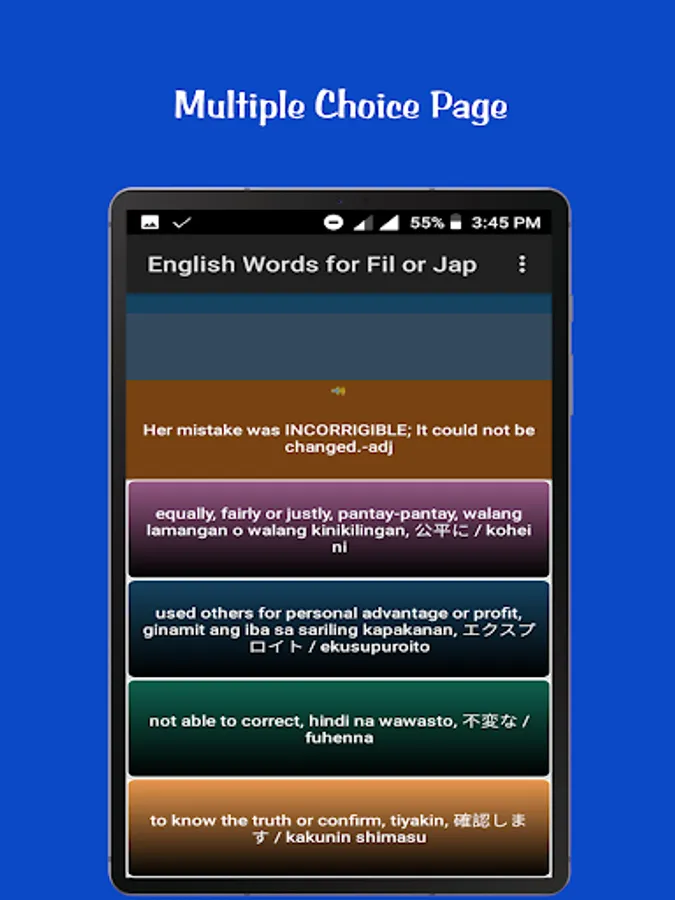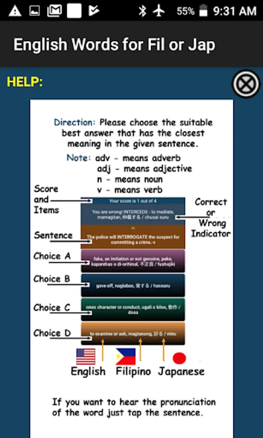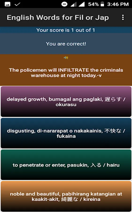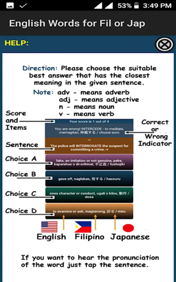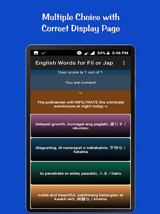 So with this simple application you will experience alternative learning to improve and develop communication skills by using the app you will be able to soar high and encounter different words and then apply it to your daily lives. The application is comprises of sample sentences that will give you a clue in order to select the right answer that has the closest meaning. This is an off-line application that can be used even without internet connection. A beeping sound will be heard each time you have selected the correct answer. Also by using this, you will encounter difficulties but don’t worry this is just for first timer but later you will find it easy and you will learn and upgrade your vocabulary and increase your English language competency after several times of uses in just a few days. The pronunciations are added in order to guide you on how to say each word given. You can hear it by tapping the example sentence and you can increase the sound by pressing the volume control of your device. To help you remember the word and its meaning, the right answer will be shown on your screen. It is suitable for students and professionals who are interested to learn and also for people who will take an interview or an English exam (I E L T S, TOEFL, SAT, Civil Service Exam, English Test)