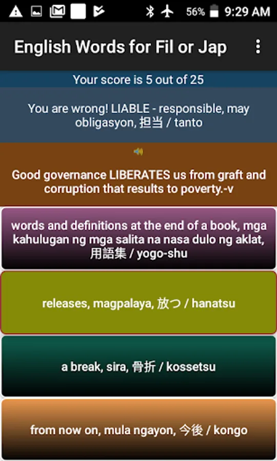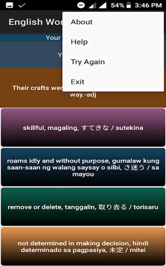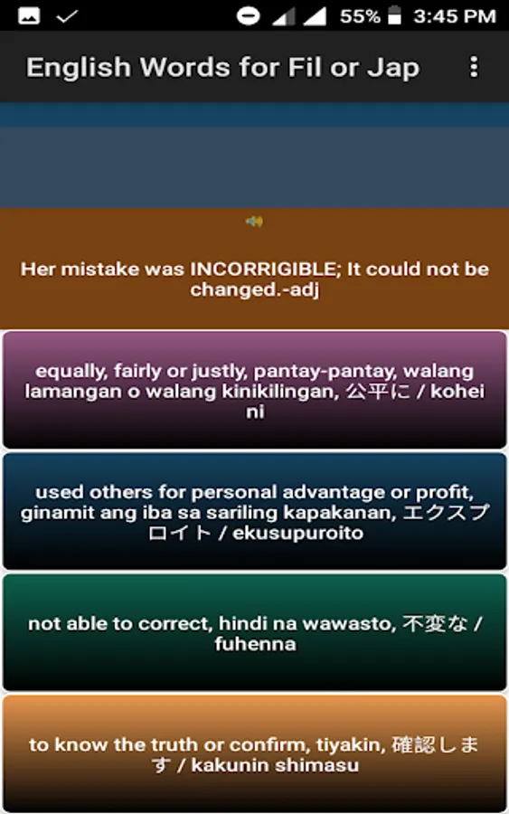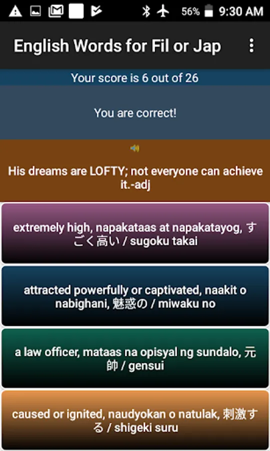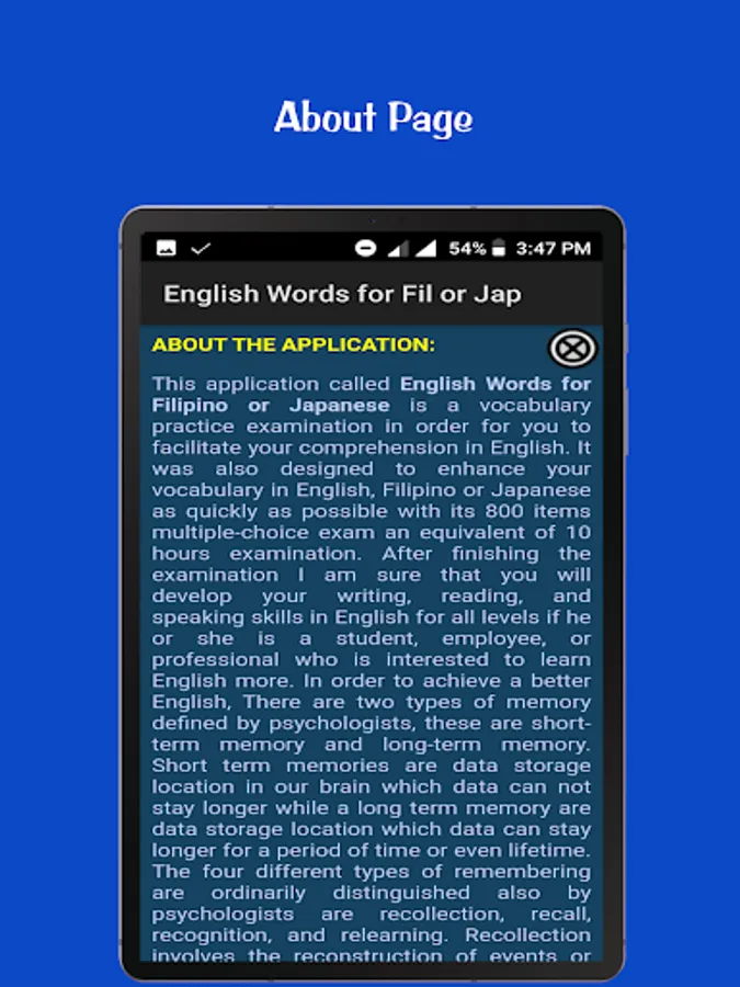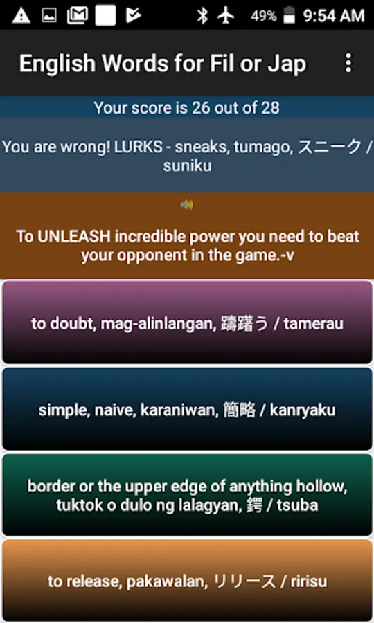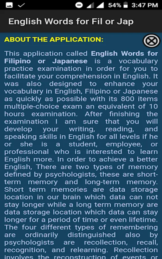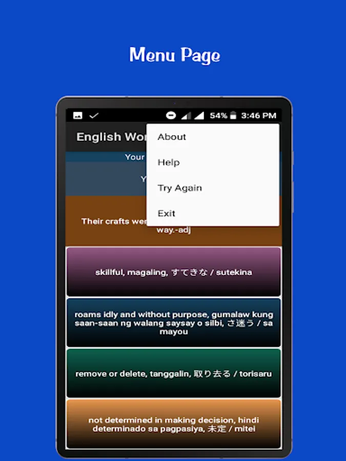 So with this simple application you will experience alternative learning to improve and develop communication skills by using the app you will be able to soar high and encounter different words and then apply it to your daily lives. The application is comprises of sample sentences that will give you a clue in order to select the right answer that has the closest meaning. This is an off-line application that can be used even without internet connection. A beeping sound will be heard each time you have selected the correct answer. Also by using this, you will encounter difficulties but don’t worry this is just for first timer but later you will find it easy and you will learn and upgrade your vocabulary and increase your English language competency after several times of uses in just a few days. The pronunciations are added in order to guide you on how to say each word given. You can hear it by tapping the example sentence and you can increase the sound by pressing the volume control of your device. To help you remember the word and its meaning, the right answer will be shown on your screen. It is suitable for students and professionals who are interested to learn and also for people who will take an interview or an English exam (I E L T S, TOEFL, SAT, Civil Service Exam, English Test)