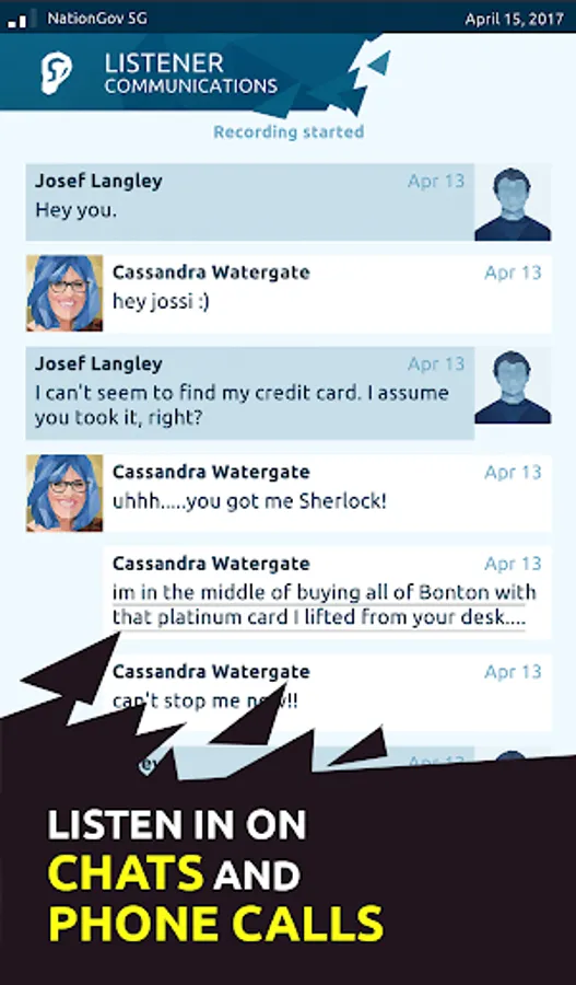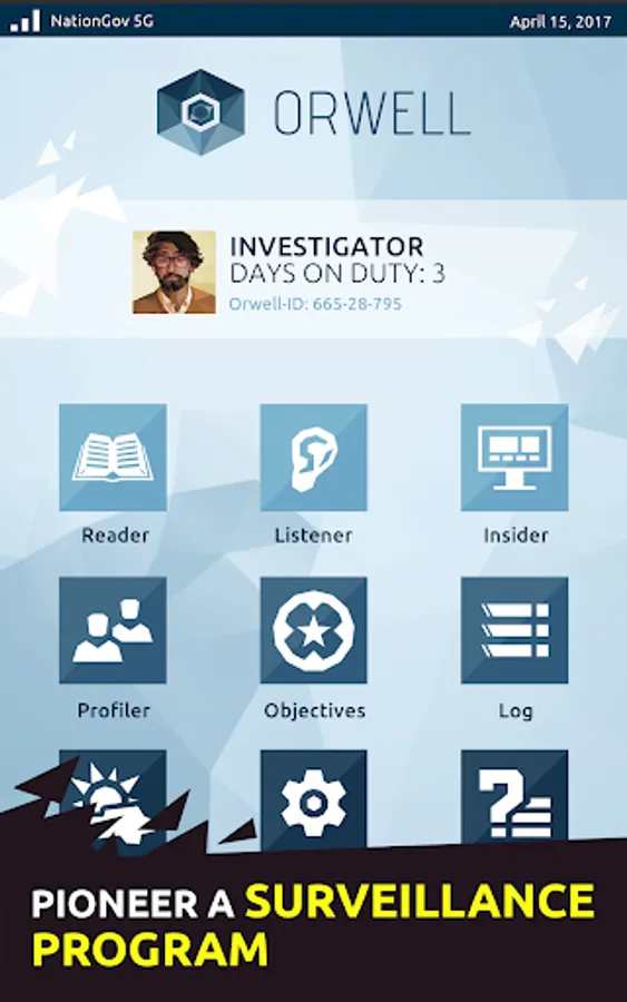 Orwell is a new governmental security program that has the power to survey the online presence of every person in The Nation. It can monitor all personal communications and access any computer. To preserve the privacy of citizens, human researchers examine the data Orwell finds and decide which pieces of information should be passed on to the security forces, and which should be rejected.