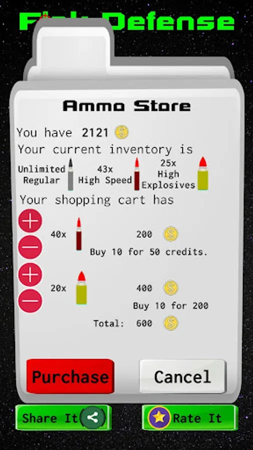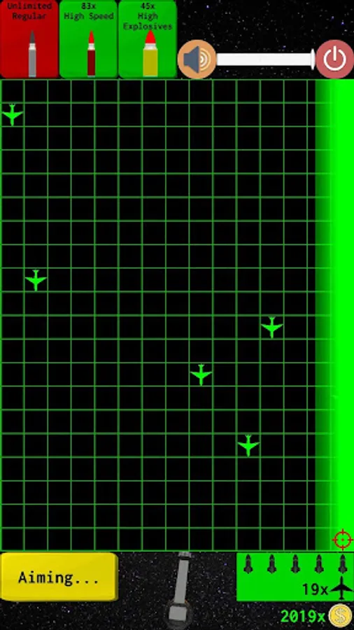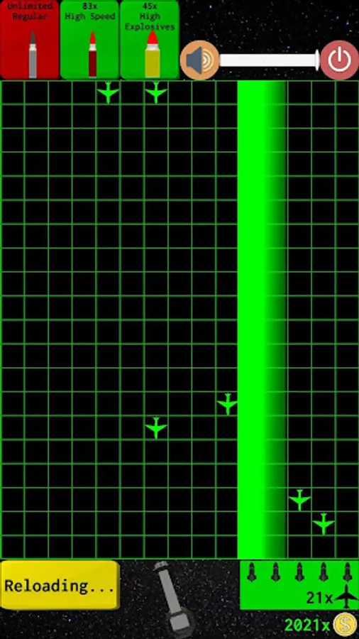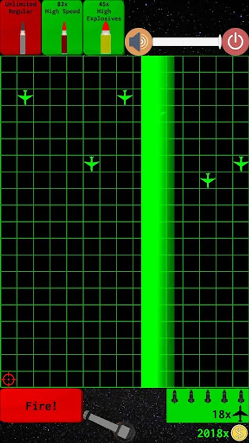 Higher scores in Flak Defense can be more easily achieved by using advanced ammo (that can be bought by using the available game credits). The advanced ammo consists of faster bullets and of large area of effect ones.