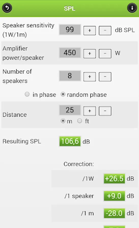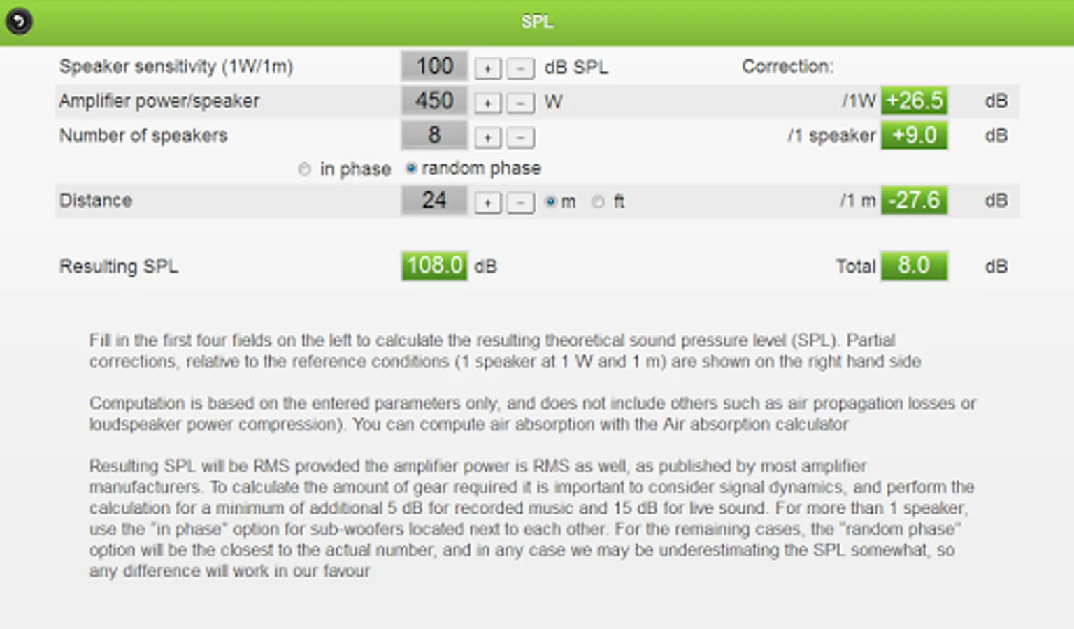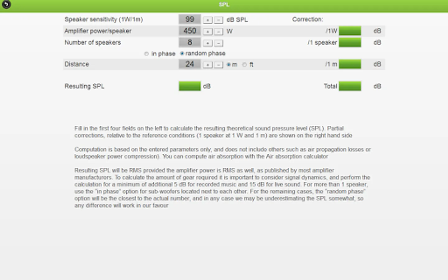 - SPL (sound pressure level). Enter sensitivity in dB SPL, power, number of loudspeakers, phase and distance