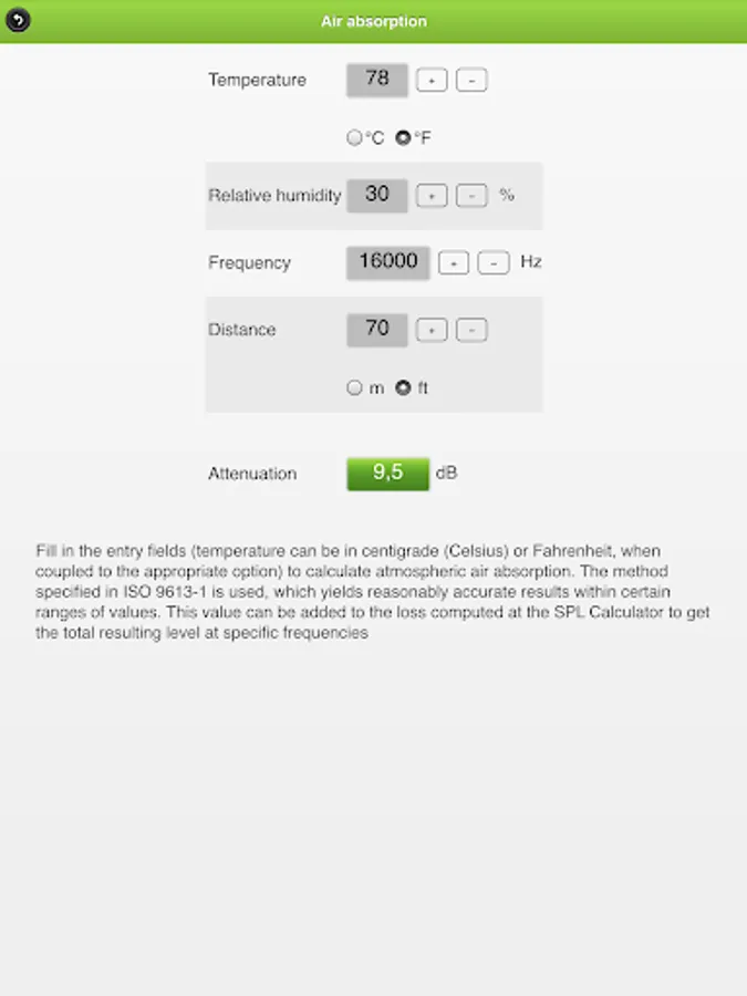 - Air absorption attenuation for a given humidity, temperature, frequency and distance