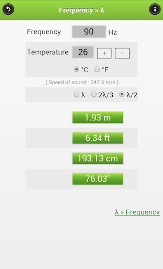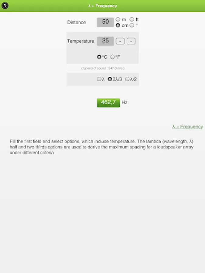 - Audio frequency «» Wavelength (includes lambda/2 and 2*lambda/3 for line arrays or subwoofer arrays)
