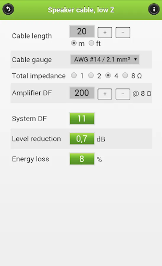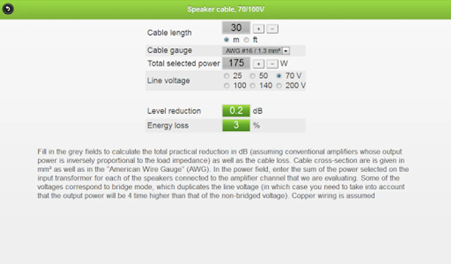 - Speaker cable: low impedance, high impedance (constant voltage line, 70V/100V). Calculates energy and level loss, system damping factor