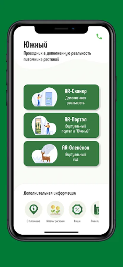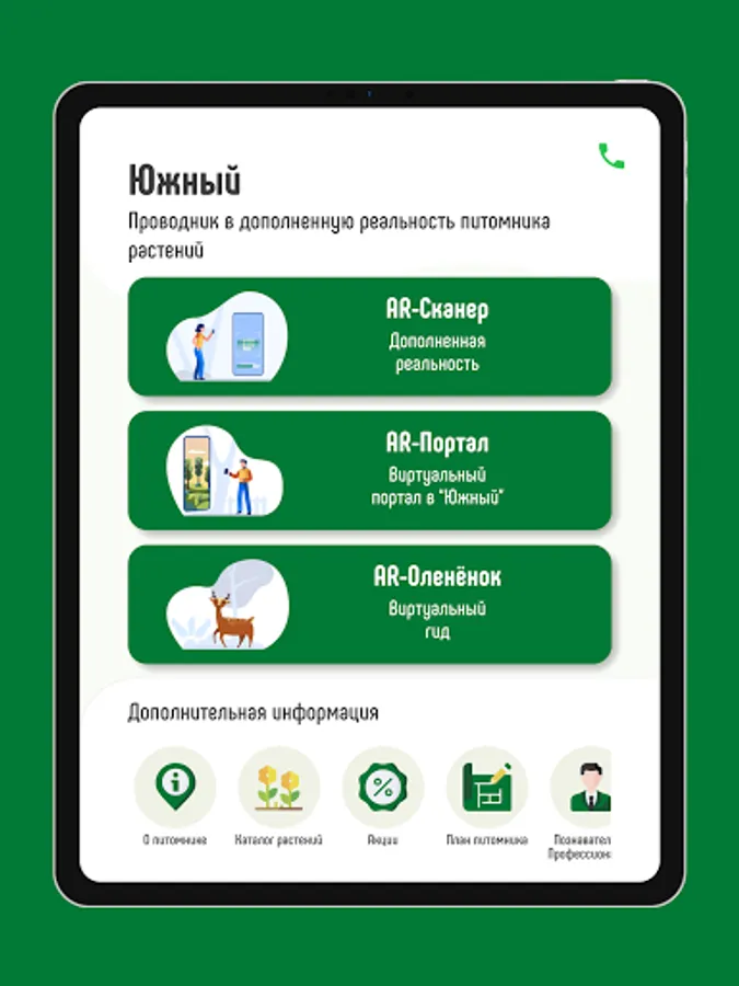 Limited Liability Company "Nursery of decorative cultures" Yuzhny "presents an application that offers an informative and vivid selection of unique photos and video materials about landscape design, an exciting excursion around the territory of the nursery in augmented reality format, accompanied by a virtual guide, in the role of which was the nursery mascot - cute deer.