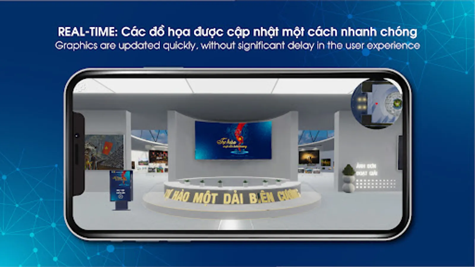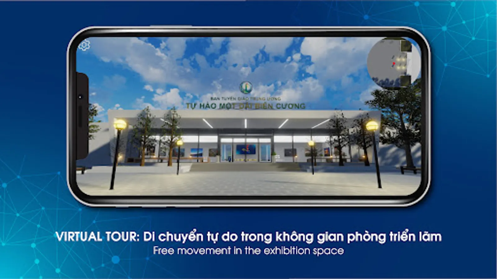 The application simulates the exhibition space with works on display, users can move freely to visit, learn about the culture and life of the people living and working on the border of the country in the future. an exhibition room space designed in a modern style with ethnic traditions.