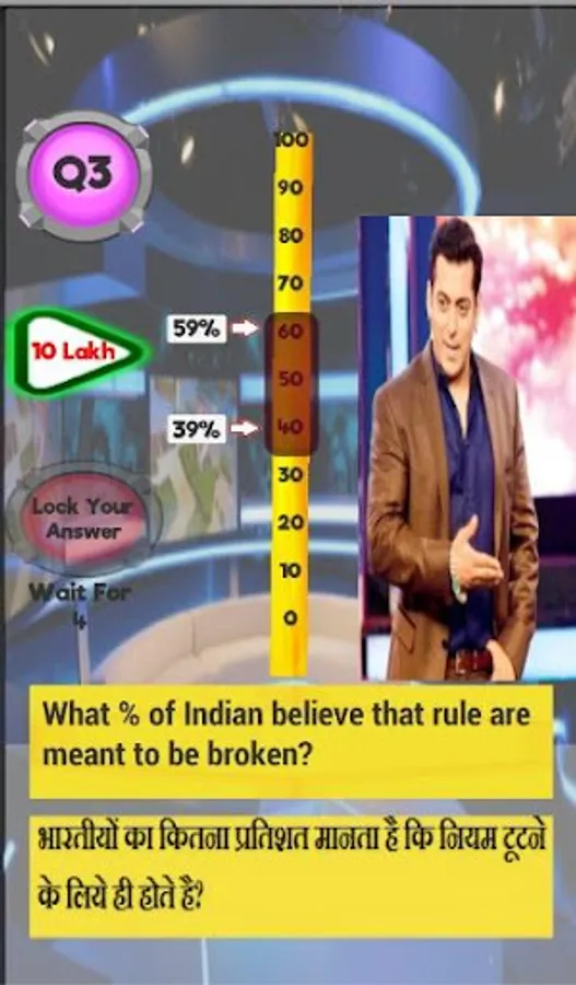 The contestant can win up to Rs. 100,000,000/- by trying to correctly approximate the survey's results within a narrowing percentage range for up to four poll questions. In this round, the contestant was given similar questions and placed a range on a scale from 0% to 100% that included the correct answer.