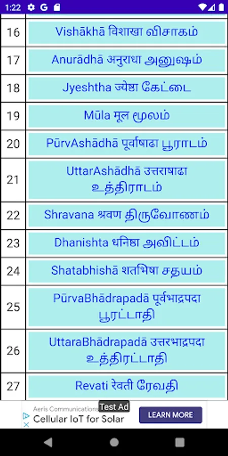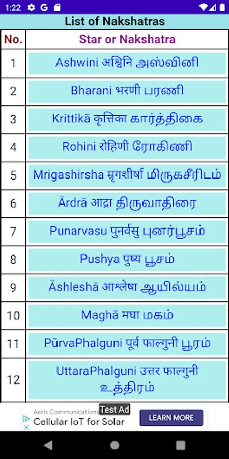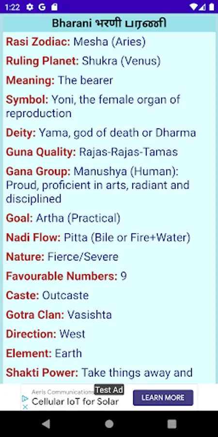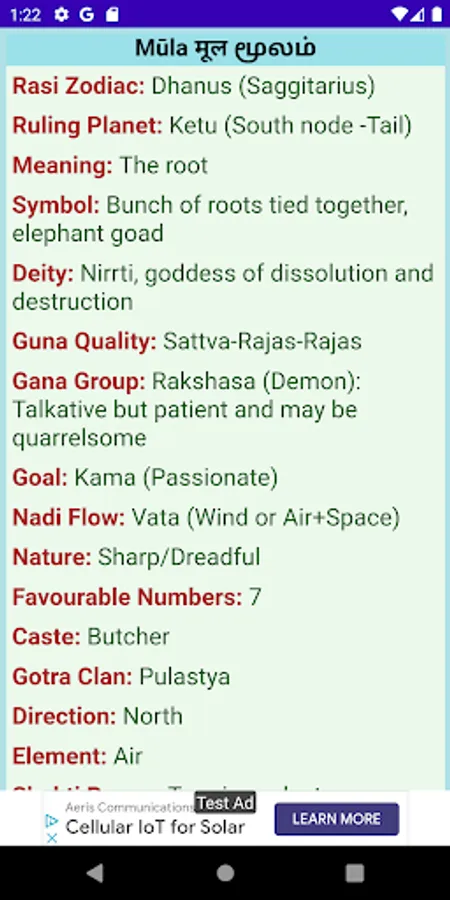# Several characteristics of the stars like rasi, symbol, planet, guna, gana, animal, nature, gender are all listed.
