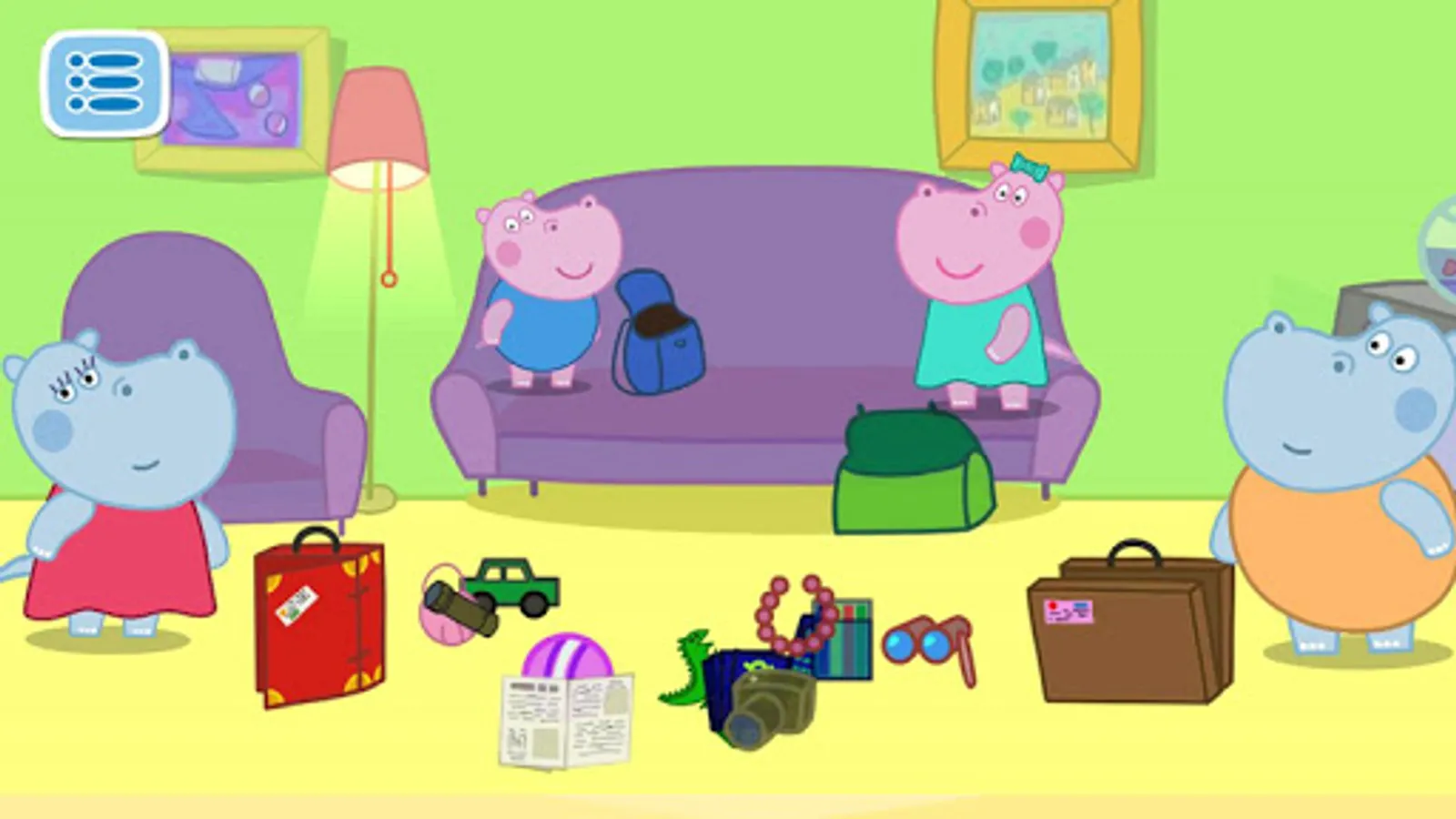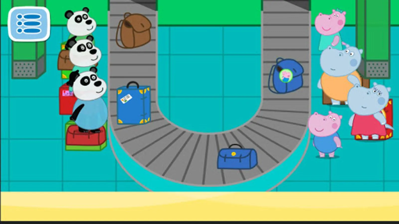 So, Hippo has won a great trip. What do we have to do next? First of all, we will help our characters to pack their bags. Put things scattered around the room into suitcases of all the family members. And then let's jump in the car and drive to the airport, where wonderful and exiting adventures will be waiting for us! All the things need to be checked on a special scanner before departure. After that, we will fly to another airport located in a far away country. And an another great kids game from the hidden objects series is waiting for us on the other end of the world. Our heroes will need to pick up their luggage. And this time, another funny element is added, where players develop their intelligence. Our characters are not the only ones to pick up the luggage. Funny pandas may accidentally remove one of the bags of our heroes from the conveyor belt. Ji is also being naughty today. He can take other passengers suitcases because he is bored. Be careful to make sure that everyone has got their own bag.