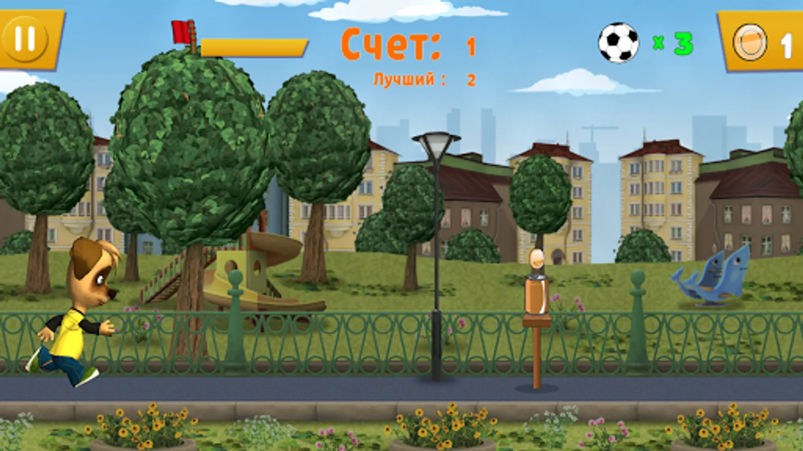 Here is the game with your favorite character Max from cartoon Pooches (Barboskiny) in the genres of Kids sports games and football or soccer runner. In this cool street football game, Max should go as far as possible using her masterly ball possession aiming the ball to the different targets. The tasks will become more complicated with your game progress.