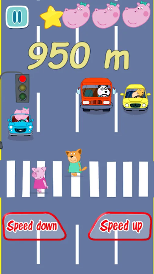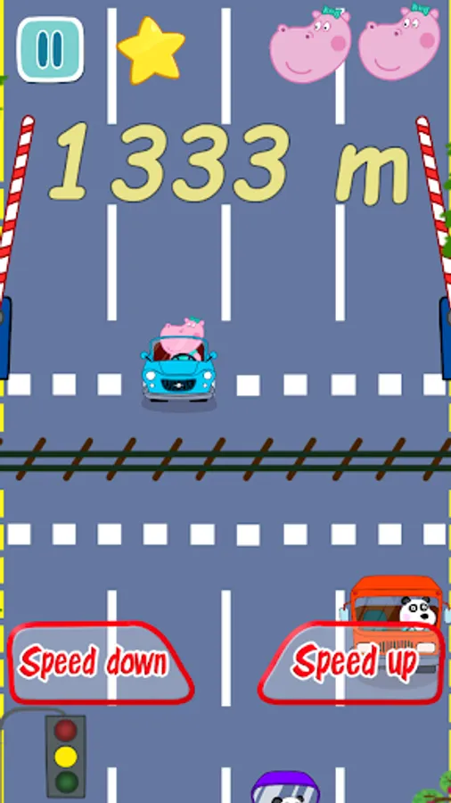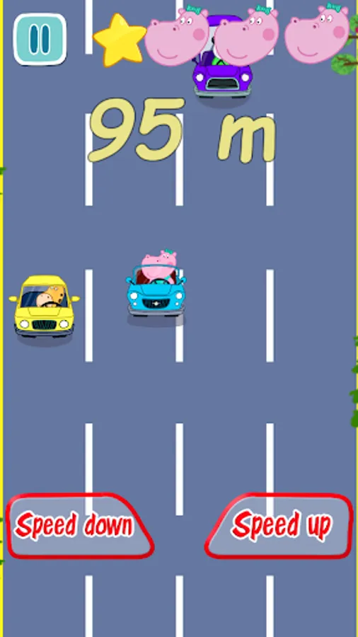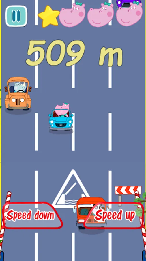 Hippo sat in her fast car and started her adventure. Steer around obstacles that will meet on your way, car traffic, logs scattered along the road, the puddles and other obstacles. On her way Hippo rides not alone, but with other cars, she needs to go around or overtake them. Help Hippo move safely while driving in the car, overcome car traffic and try not get into an accident.