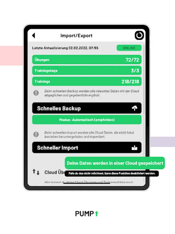 Pump offers extensive features for creating exercises and training days. These can be added to the weekly cycle and repeated in progressive blocks.