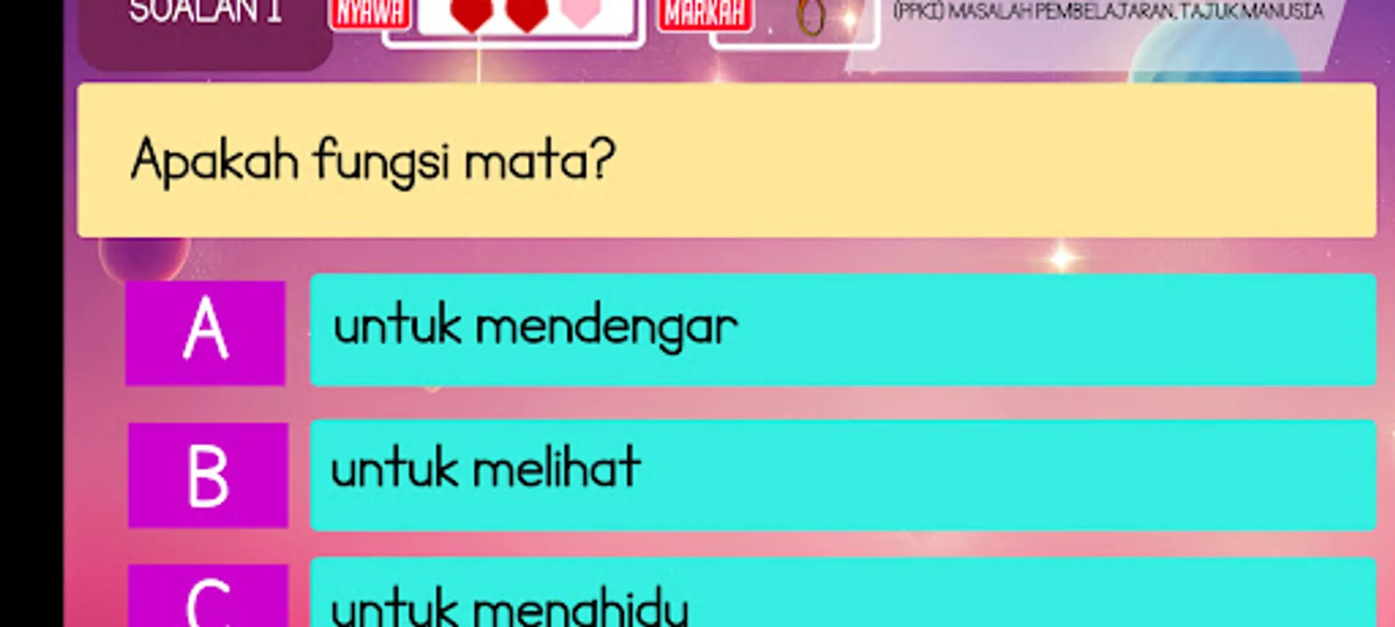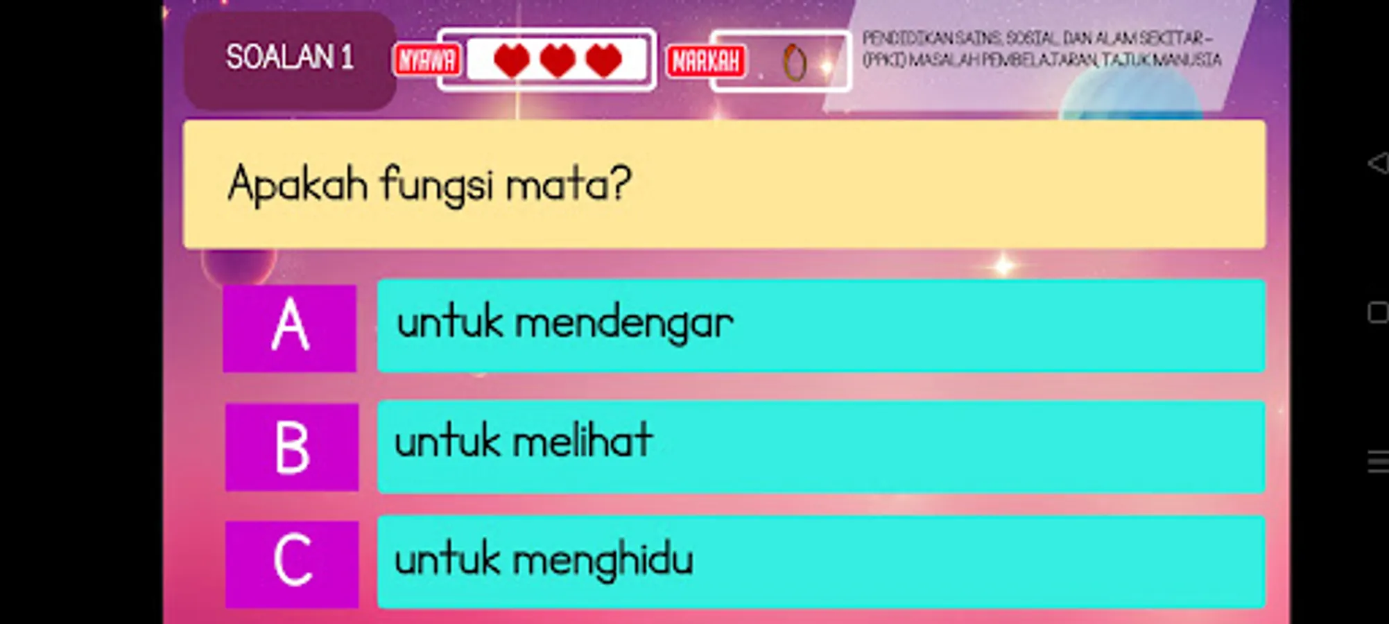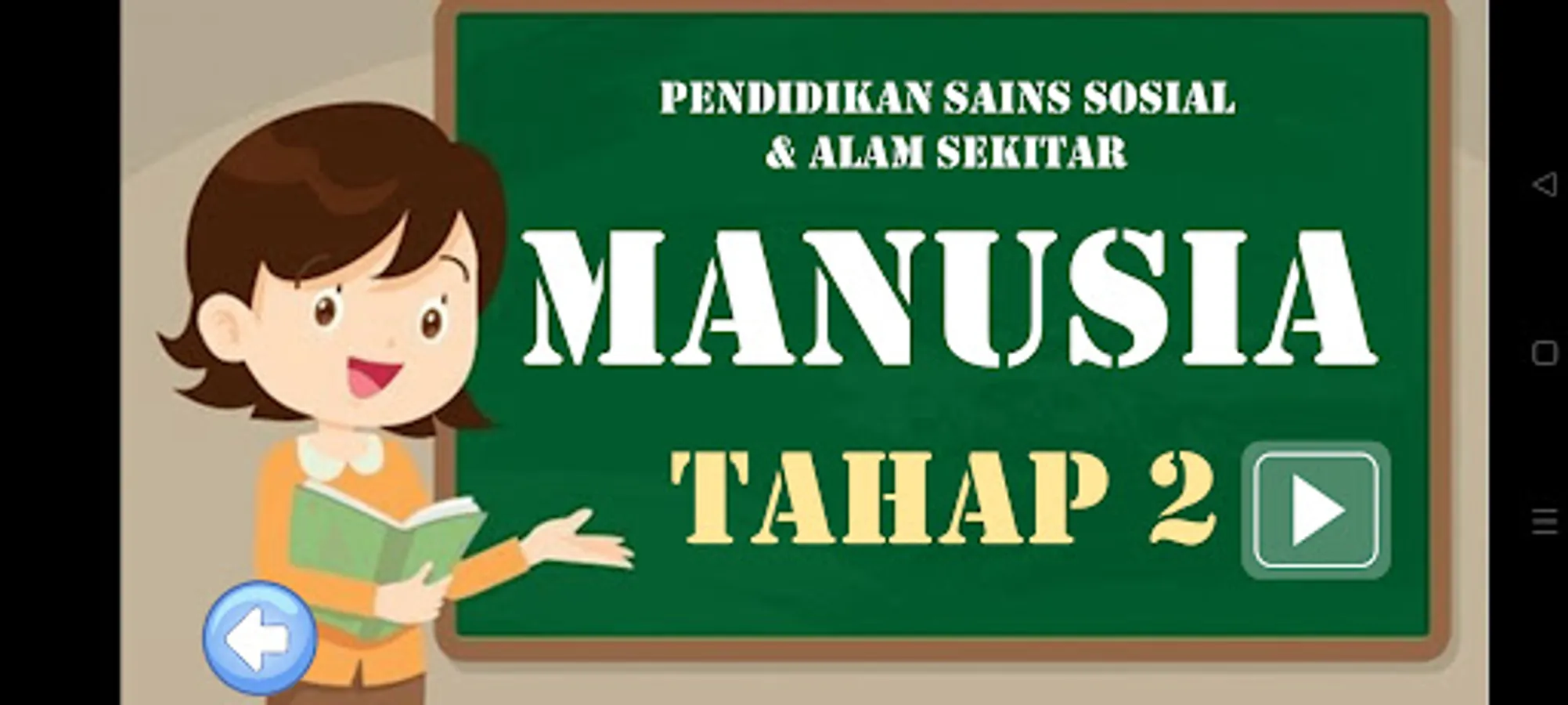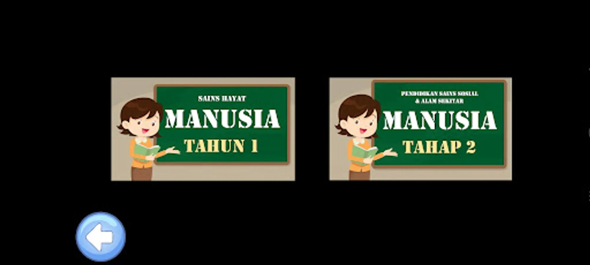 Aplikasi yang menarik minat murid meneroka mata pelajaran Sains aliran perdana dan aliran Pendidikan Khas. Berfokuskan tajuk Manusia, aplikasi ini diharapkan dapat membantu murid mengenali kelebihan diri sendiri dan manfaat setiap anggota badan yang berfungsi mereka untuk terus hidup. Murid juga boleh mencuba menjawab soalan kuiz interaktif dan mendapatkan bintang sebagai eviden Pentaksiran Bilik Darjah.