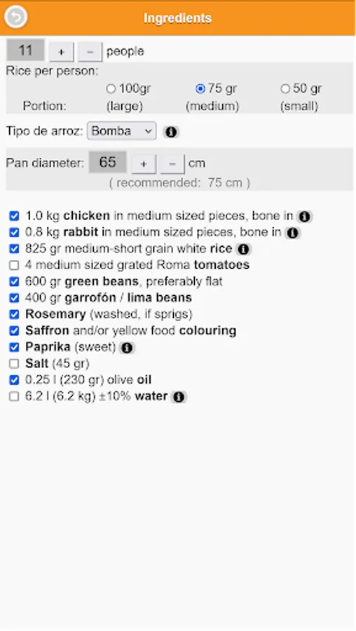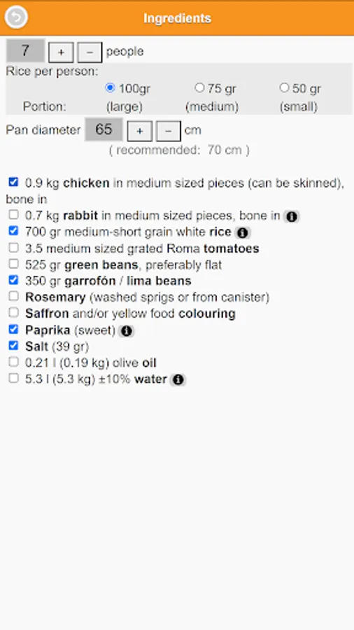 - List of ingredients that automatically calculates amounts as a function of the number of people, portion size and the size of the pan