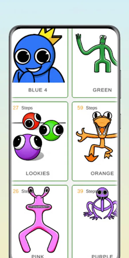 The lessons will help you draw rainbow frien characters like blue, green, orange, pink and many more accurately and beautifully. Step by step following the lessons, you can draw not only quickly, but also beautifully!