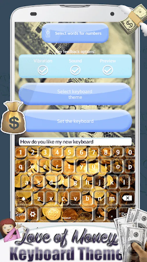 💲 If you’re constantly text messaging with your best friends and would like to see dollar bills and euro banknotes and coins everywhere, then our sweet money keyboard themes is what you need! The virtual money keycaps and background themes free are perfectly designed and will suit your text messaging needs. Customize your phone keypad or tablet and allow the money rain to take over your smartphone. You could also set a money live wallpaper and match it with your dollar sign color keyboard. Come on, make your everyday SMS messaging funnier than ever using “money with wings emoji”, money-mouth emoticon, money bag and other smiley faces!