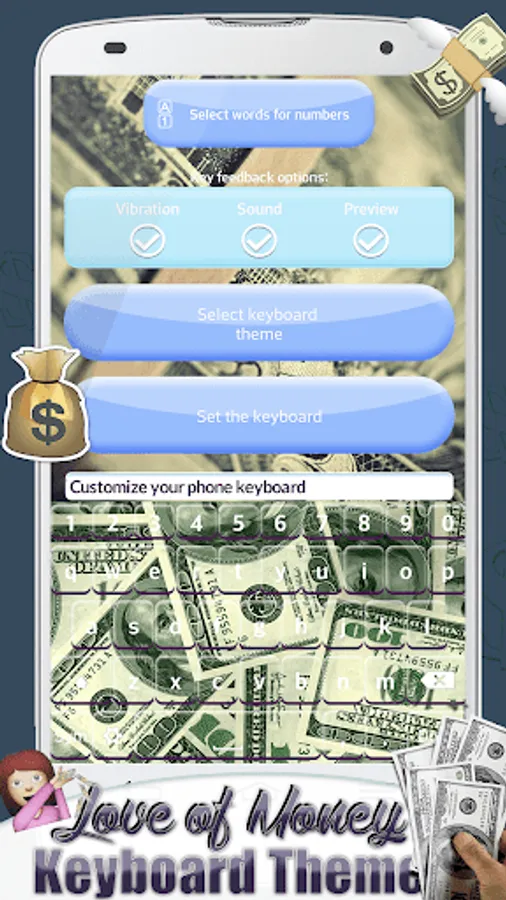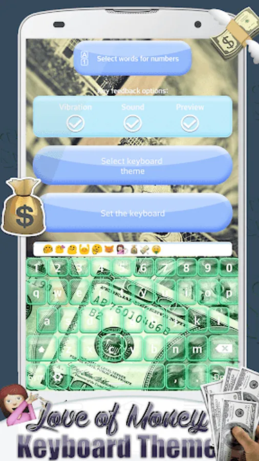 💲All the money lovers, prepare your fingers for typing over your custom keyboard with lots of cash pics on it! If you would like to decorate your phone with dollar bills as your keyboard background and feel like a billionaire boy, then our “money theme” will thrill you! Choose your keyboard decoration – money in a safe background, roll of bills, money box themes free and so much more. There’s no doubt that you’ll have the best virtual keyboard design ever! Besides, our cool emoticons and smiley faces, such as money bag emoji, money-mouth face emoji or money with wings emoticon will make your text messages more interesting. Obtain a custom phone keypad 💲Love of Money Keyboard Theme 💲 free, “change keyboard” skin and start writing SMS messages to you best friends adding some making money quotes and have fun!