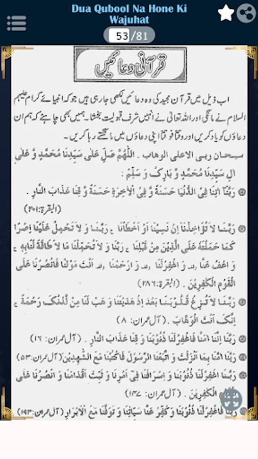 These rohani dua (or duas / dua'in) (as believed) are capable of keeping our routines in peace by reminding our true God (Allah the greatest) in every aspect of our life, no matter where we live around the world. Qurani Duain is a collection of various ayah (ayat / ayaat / ayaah / aayat / aayaat) from the Holy Quraan provided with Urdu translation so that every individual can understand the meaning and the importance of the specific ayat-e-kareem which will keep every muslim closest to God in their daily lives and those duas may bring barkaat and rizq (rizaq) in their family and closed ones, making life peacefull, keeping evil thoughts away in order to have happy life here on Earth and there-after.