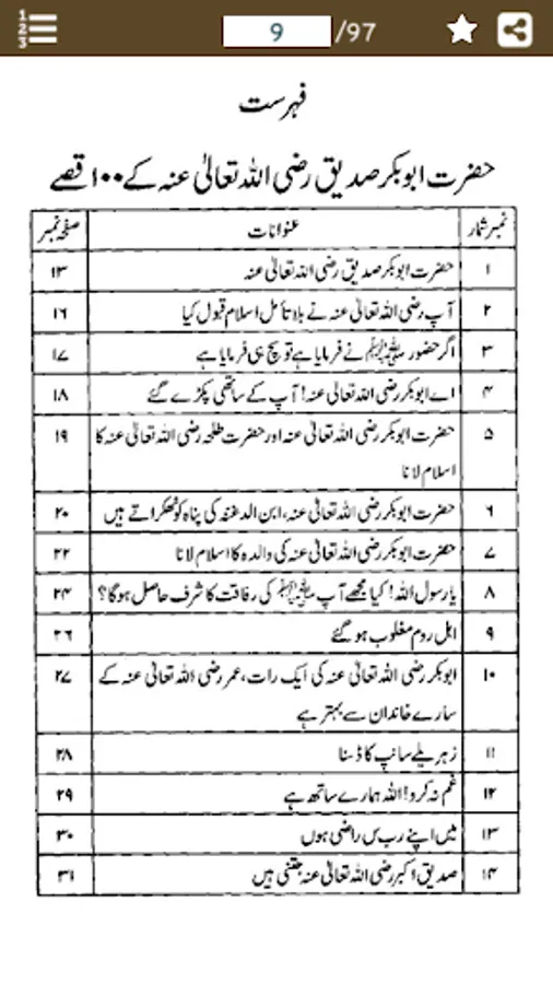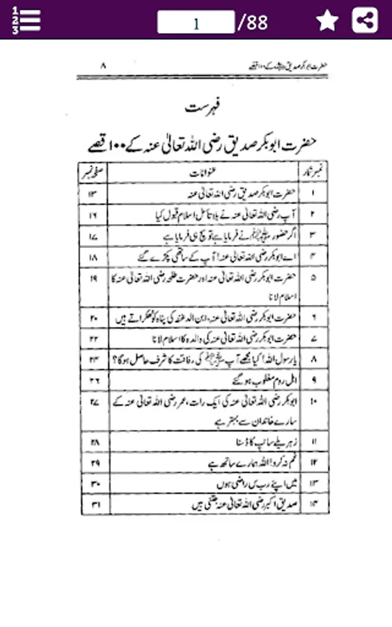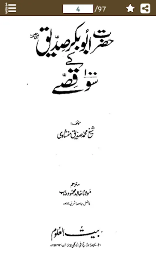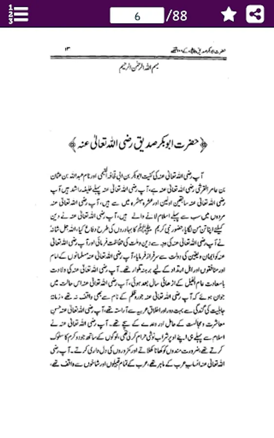 This App contains 100 Qissay of Hazrat Abu Bakr Siddiq (R.A) in URDU. And the most important thing that Hazrat Abu Bakr Siddiq (R.A) is the first personality of Islam who has accept the ISLAM first. Hazrat Abu Bakr Siddiq (R.A) two year younger of Prophet Muhammad (SAW). prior of Islam Hazrat Abu Bakr Siddiq (R.A) and Prophet Muhammad (SAW) were best friends. And Hazrat Abu Bakr Siddiq (R.A) belongs to respectable and noble tribe Bano-Tamim thats the branch of Quraish.