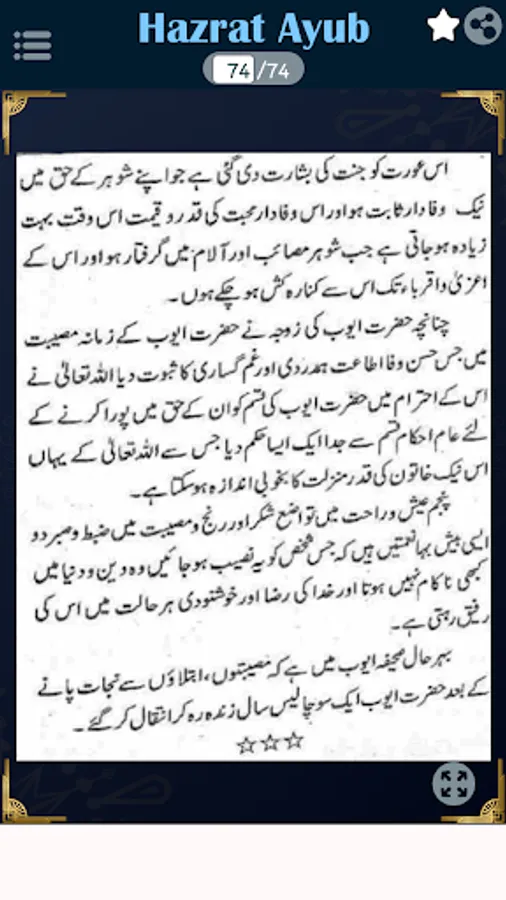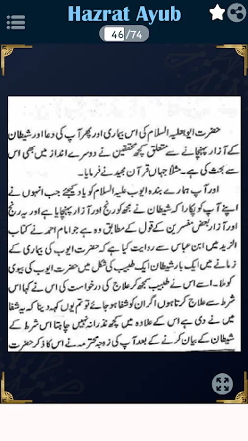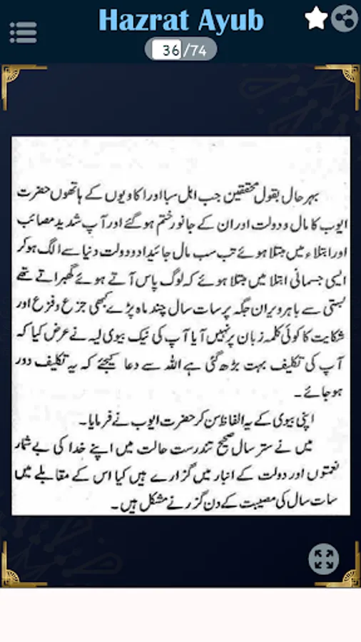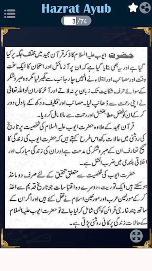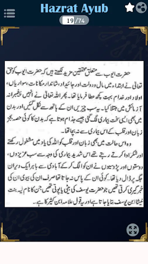 Hazrat Ayub علیہ السلام Hazrat Ishaq علیہ السلام ki aulaad mein se hain aur un ki walida Hazrat Loot ke khandan se hain. Allah pak ney aap ko har terhan ki nematon se nawaza tha. Hussan soorat bhi aur maal o aulaad ki kasrat bhi, be shumaar maweshi aur khait o baagh waghera ke aap maalik they. Jab Allah pak ney aap ko azmaish o imtihan mein dala to aap ka makaan gir parra aur aap ke tamam ferzandan is ke neechay dab kar mar gaye aur tamam janwar jis mein senkrron oont aur hzarha bakriyan theen, sab mar gayen. Tamam khaitiyan aur baaghat bhi barbaad ho gaye. Gharz aap ke paas kuch bhi baqi nah raha.