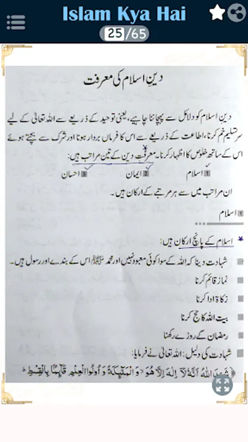 ۞ Hadees-e-Nabawi: Islaam Ye Hai Ki tum Shahadat(Gawahi) Do Ki Allah Ke Siwa koi Ibaadat ke Laaiq Nahi aur Muhammad (Sallallahu Alaihay Wasallam) Uss Ke(Allah Ke) Rasool hain, Namaaz Qaaim Karo, Zakaat Ada Karo, Ramazaan Ke Roze Rakho Aur Agar Hajje Baitullah Jaane Ka Maal Paas Me Hai Tou Hajj Karo.