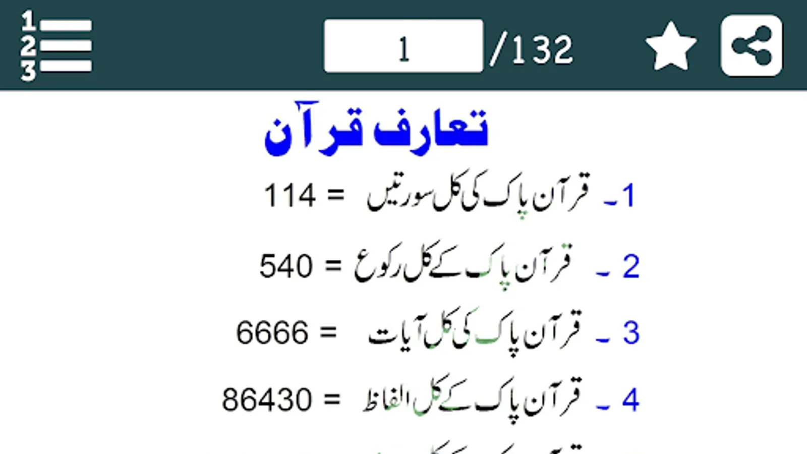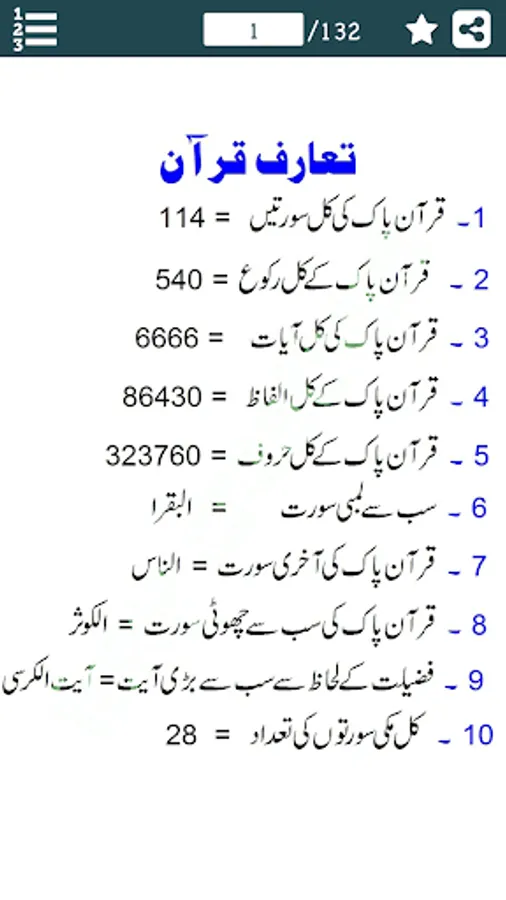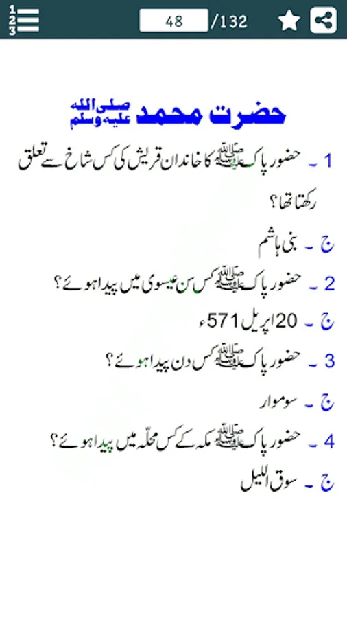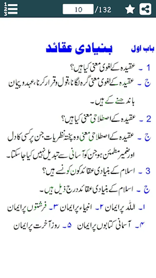 This app is comprised of questions and their answers about basic fields of Islam. This app is rich with Islamic knowledge and hope will be helpful for students and also for other muslim brothers and sisters. This is a reference app for common man person who wants to know the basic knowledge of different aspects of islam e.g. Quran, Surah, life of prophet Muhammad PBUH i.e aswa e hussna, Aakhirat, Namaz, Dajjal, Dua, Durood, Eid, Farishtay, Zakat, Roza, Hajj, Maut & Qiyamat etc.