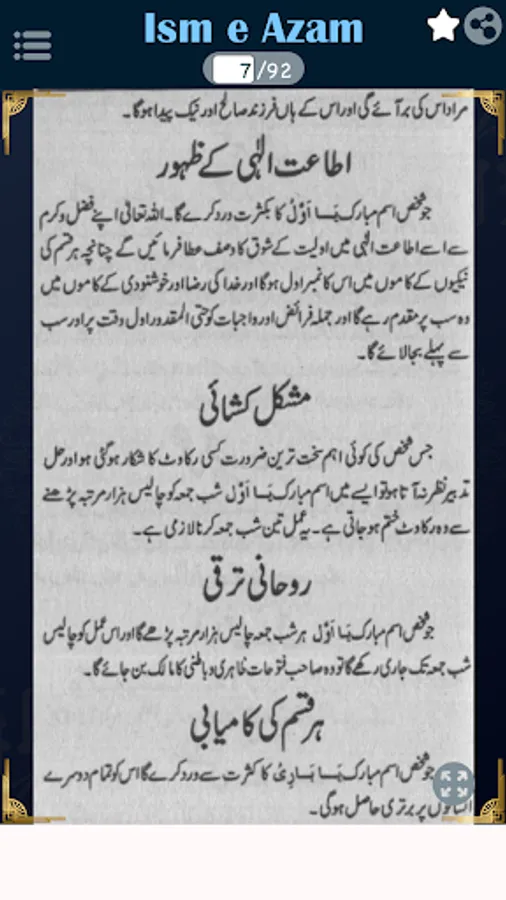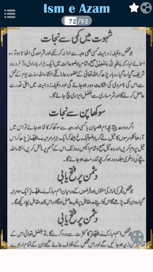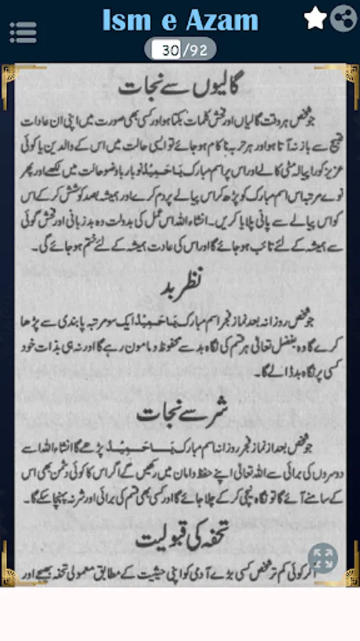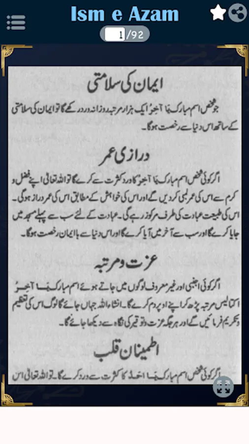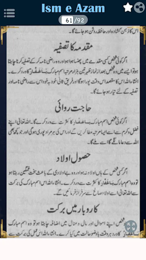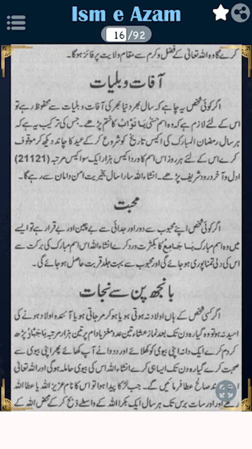 In this book, you can read about Aurad o wazaif, Isme azam ke fayde, Mustajab ul dawat, Asabi nizam ko barqarar rakhna, Jara ka bukhar, Asaib ko dafah karney ka amal, Daimi bukhar ka ilaj, Nazar ki kamzori ka ilaj, Kisi ko apni tarf mail karna, Hadsat se hifazat ka amal, Eman ko mazbot karne ka amal.