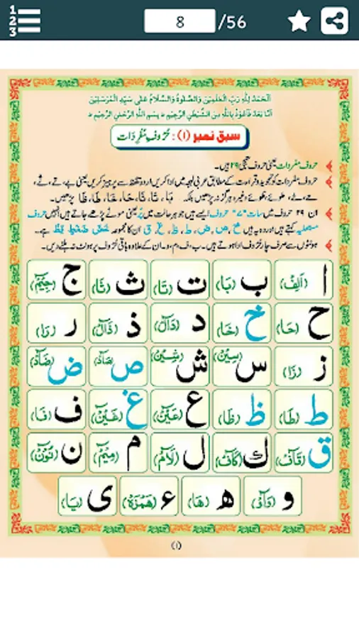 Madani Qaidah in Urdu is an Islamic App for Muslim brother and sisters. This app is based on Book "Madni Qaidah" written by Dawat e Islami (DawateIslami) Founder Sheikh e Tariqat Ameer e Ahle Sunnat Hazrat Allama Molana Abu Bilal Muhammad Ilyas Qadri Razavi.This Book Includes Superb Knowledge Of Primary Qaida for Reciting the Holy Quran from the Correct Origins Plus Rohani Ilag And Many More. May these information be useful to our Muslim brothers, sisters and fellows and they share with their beloved ones too.