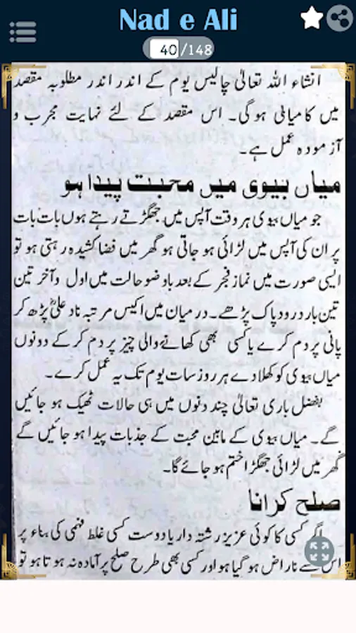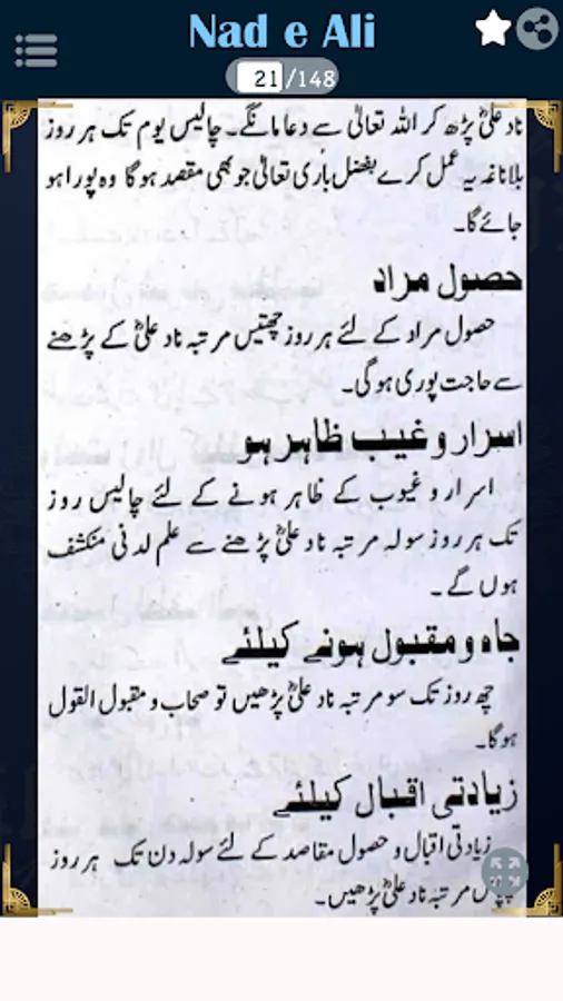 In this book, You can read Nad e Ali wazifa for Ziarat e Rasool Kareem (SAW), Bekhuwabi Ka Khatma, Halakat e Zalim Dushman, Jadu Ka Asar Zail Karna, Nazar e Bad Se Hifazat, Sehar se Nijaat, Kalay jado Ka Tord, Shehd ki Makhi K Dhang Ka ilaaj, Dushman ki Zuban Bandi, Qaid Se Rehai, Wasat e Rizq Ka Amal e Khas, Shareer Janwar ko Qabu Karna, Asaib ko Jalana, Naqsh e Nad e Ali k Faidey, Jismani Kamzori, Dilli Murad Pori Karney Ka Amal, Dawat e Nad e Ali Kabeer Ba Moukal, Namaz e Istekhara, Hasol e Taraqi o izzat.