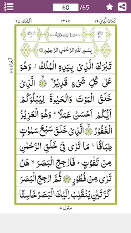 Surat al-Mulk (Arabic: سورة الملك, "Sovereignty, Kingdom") is the 67th chapter (surah) of the AlQuran, comprising 30 verses. The surah emphasizes that no individual can impose his will on another; he may only guide and set an example.